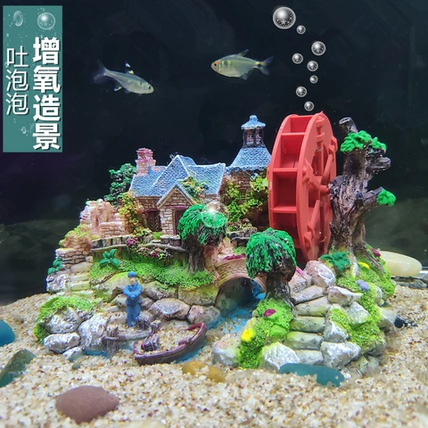 Aquarium Landscaping Fish Tank Decorations Small Ornaments Simulation Small House Windmill Air Pump Can Turn The Waterwheel