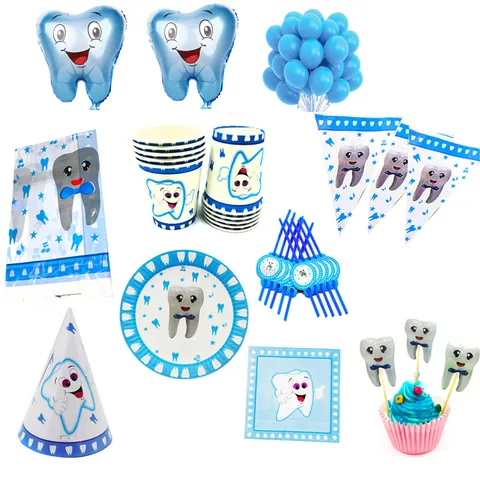 Blue Teeth Theme Disposable Tableware Boy's First Tooth Birthday Party Decorations Disposable Paper Plates Napkins Cups Banners
