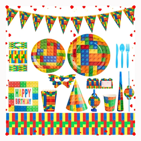 Colored Building Block Disposable Tableware Set, Party Decoration, Paper Tray,napkin, Tablecloth, Suitable For Boys And Children