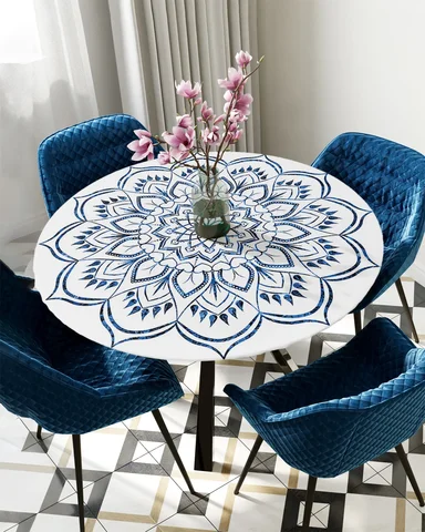 Mandala Pattern Retro Blue Round Elastic Edged Table Cover Protector Cloth Waterproof Polyester Rectangle Fitted Tablecloth
