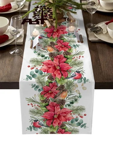 Christmas Fir Tree Robin Poinsettia Winter Table Runner Wedding Table Decoration Coffee Table Kitchen Table Cloth Table Cover
