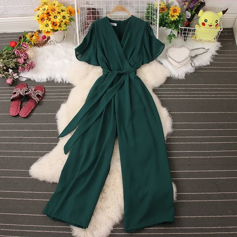 Women's Korean Style Commuter Jumpsuit, Temperament, V-neck Tie Waist, Slimming, Simple, Solid Color, Drooping, Wide-leg, Summer