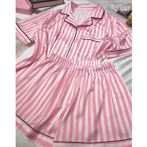 Women's Ice Silk Pajamas Homewear Short Sleeve Two-piece set Summer Loose Pink Striped Pajamas Suit Femme Satin