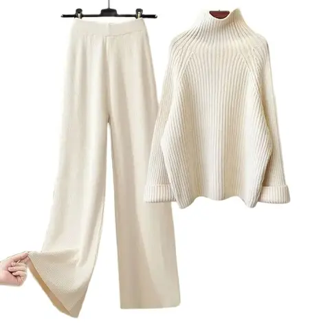 Spring Warmer Two Piece Wide Leg Pants Set Knitted Pullover Sweater+Knitted Wide Leg Pants Women Two Piece Suit Trousers
