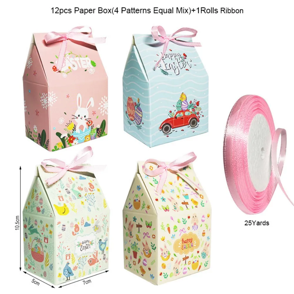 Packing list:12pcs easter gift candy box + 1 roll 25 yards ribbon