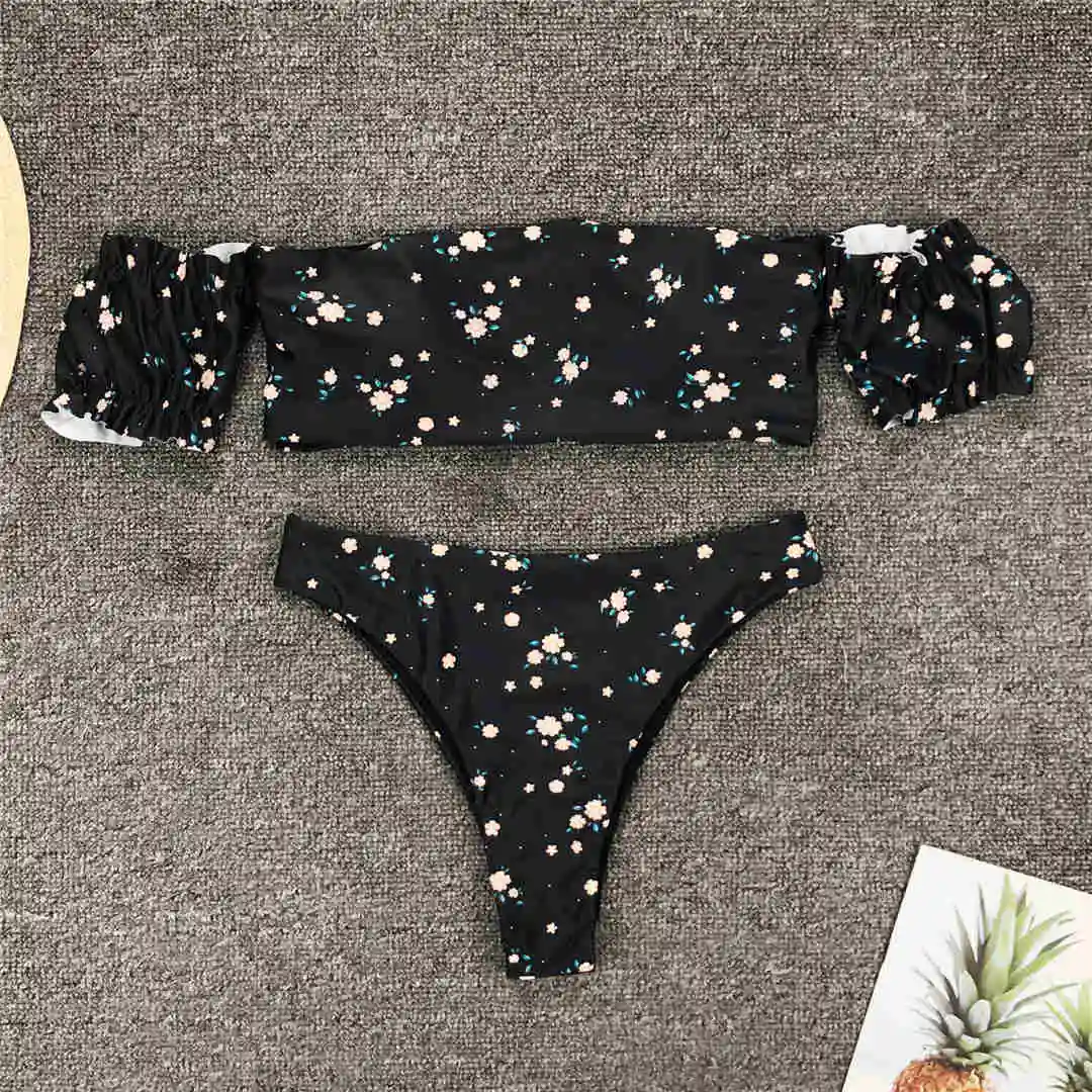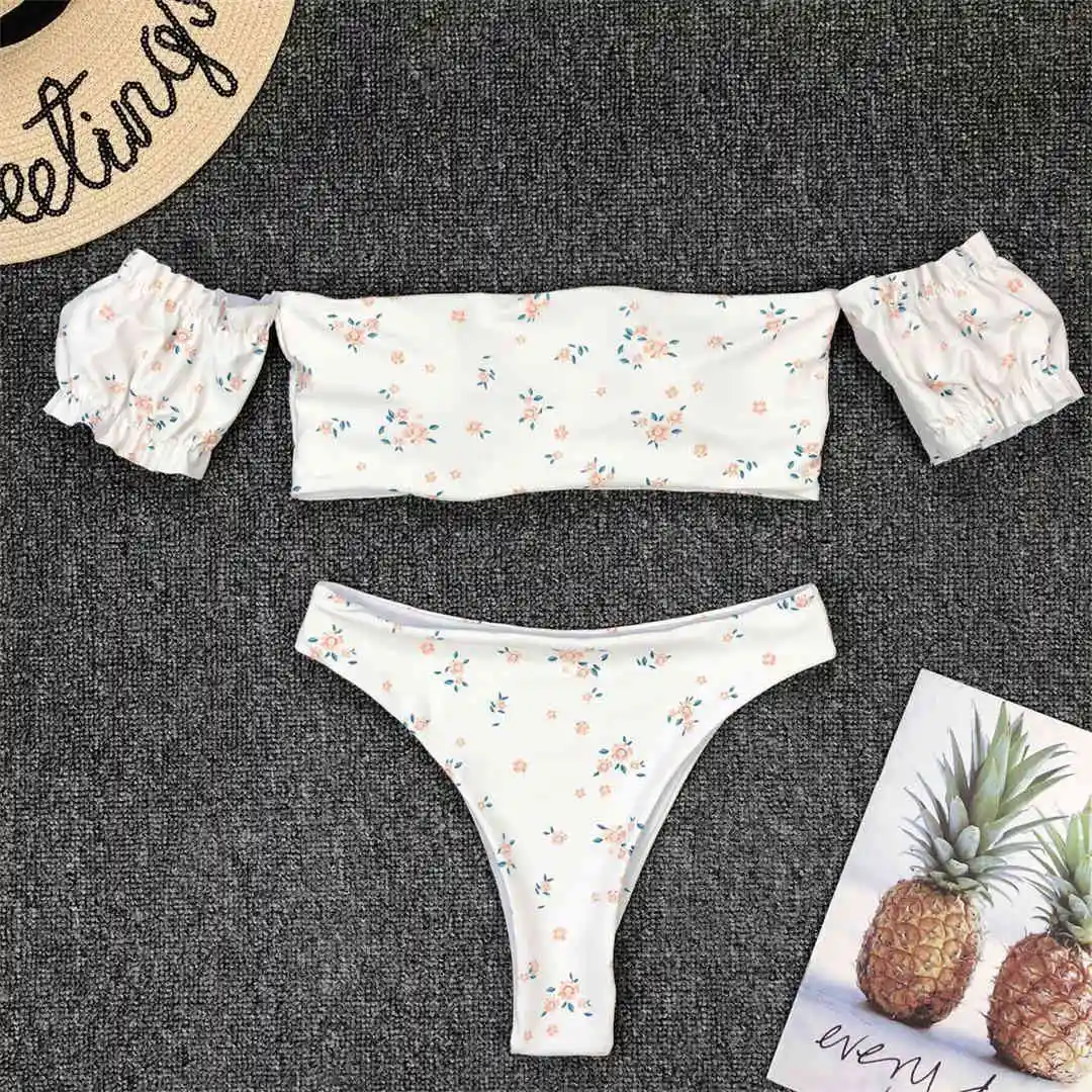 2020 Floral Off Shoulder Bikini Female Swimsuit Women Swimwear Two-pieces Bikini set Mid Waist Bather Bathing Suit Swim V1671