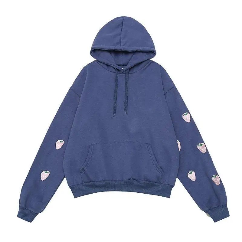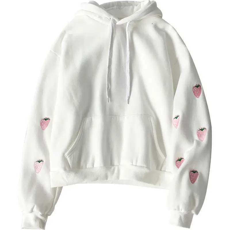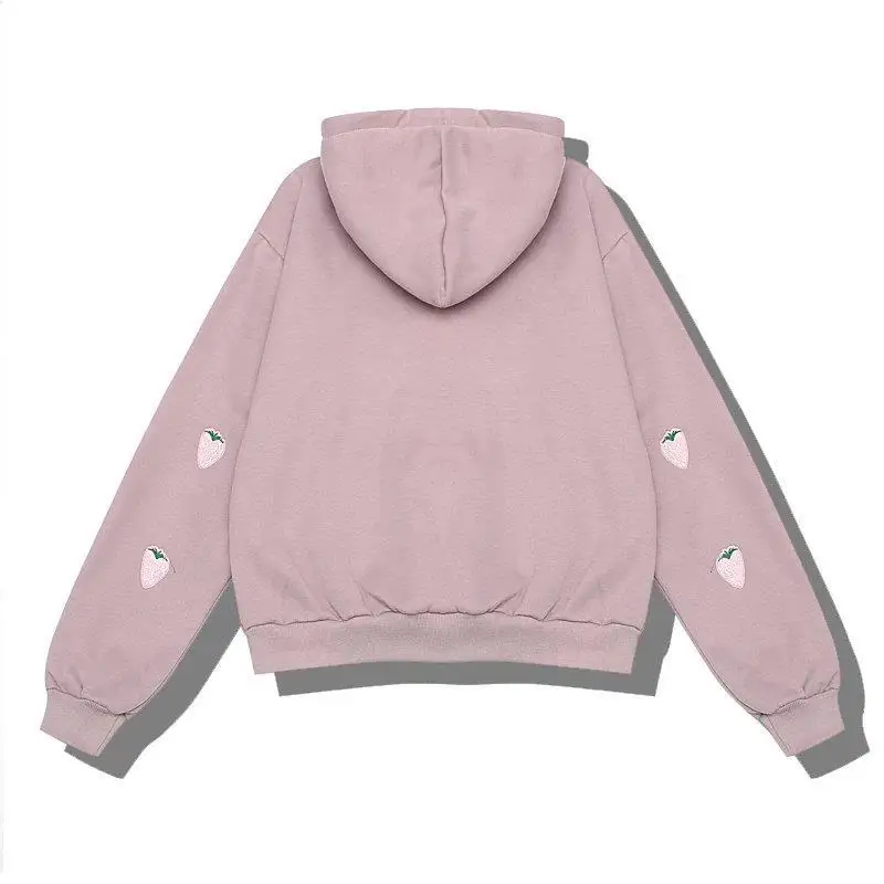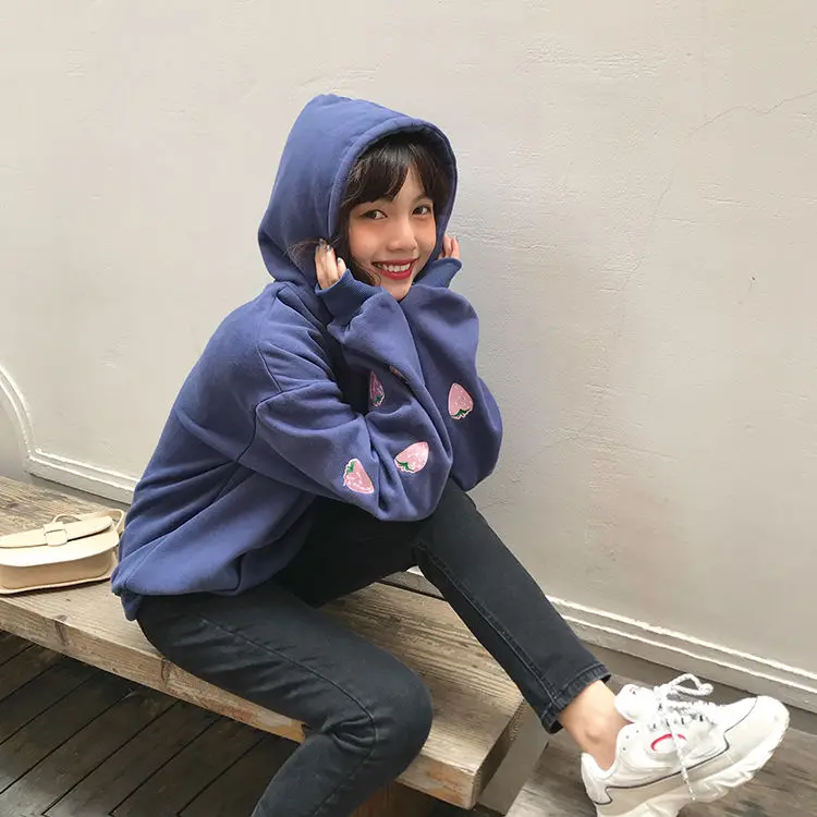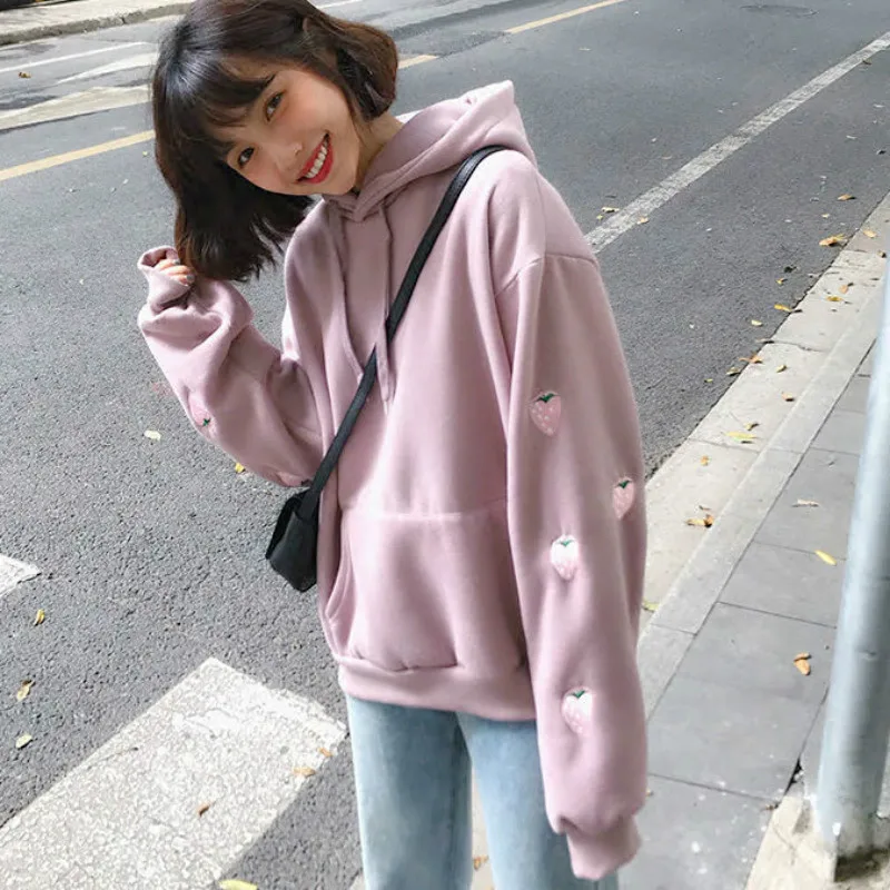 2020 Simple Harajuku Strawberry Embroidery Lavender Pink Sweatshirt Women Kawaii Loose Long Sleeves Tops Oversized Hoodies