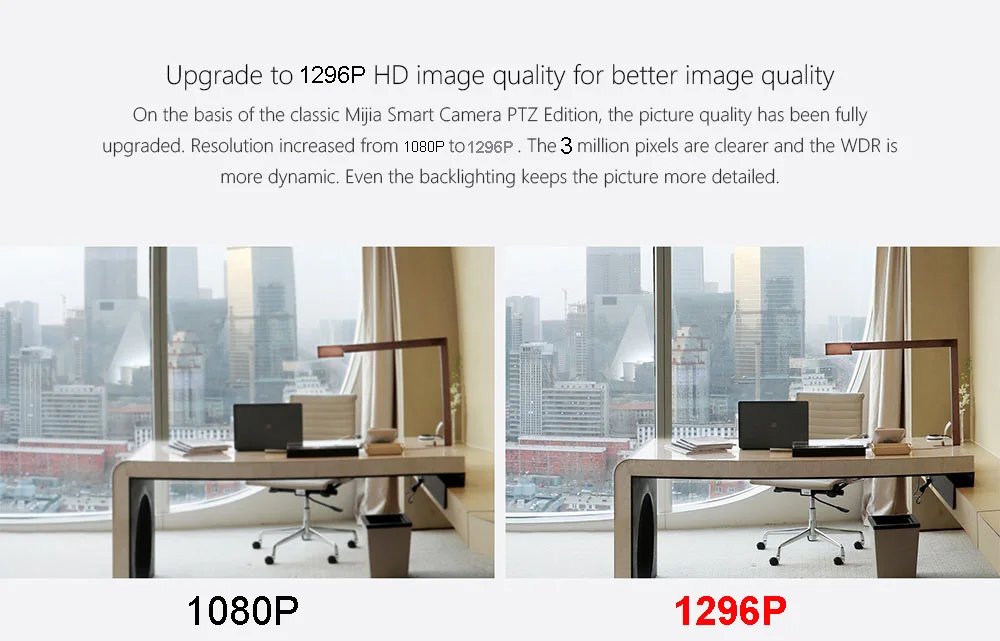 Pan Tilt control with dual motors , 360 degree panorama viewing angle Night vision function 1080P resolution , shoot high-quality and smooth video Two-way audio , with internal microphone and speaker ”Mi Home” APP , download from Google Play or Apple Store Separate antenna , strong wireless signal Support Android 4.0 and above, iOS 7.0 and above