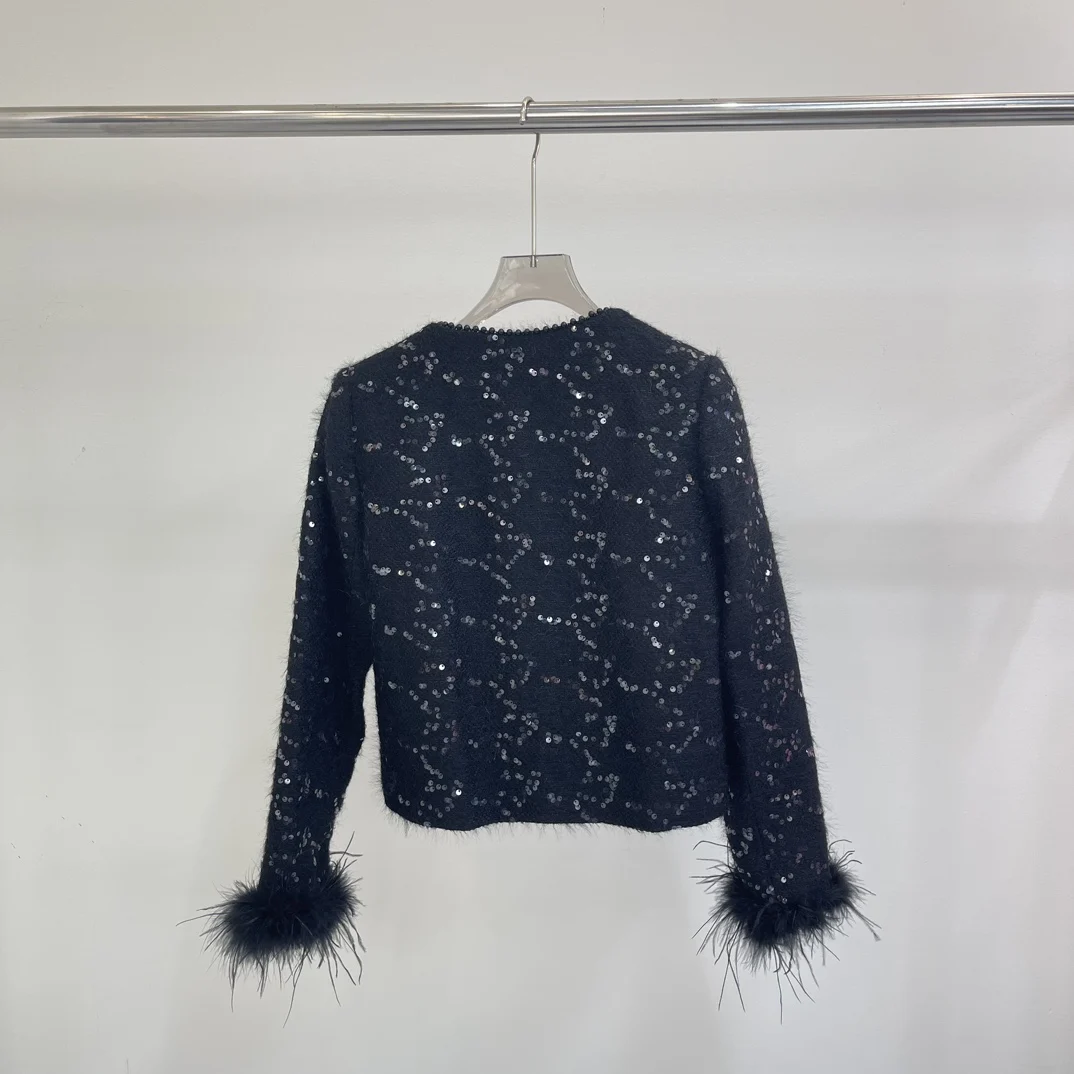 2023 Autumn/Winter New Elegant Style Feather Splice Cuff Sequin Wool Versatile Short Coat