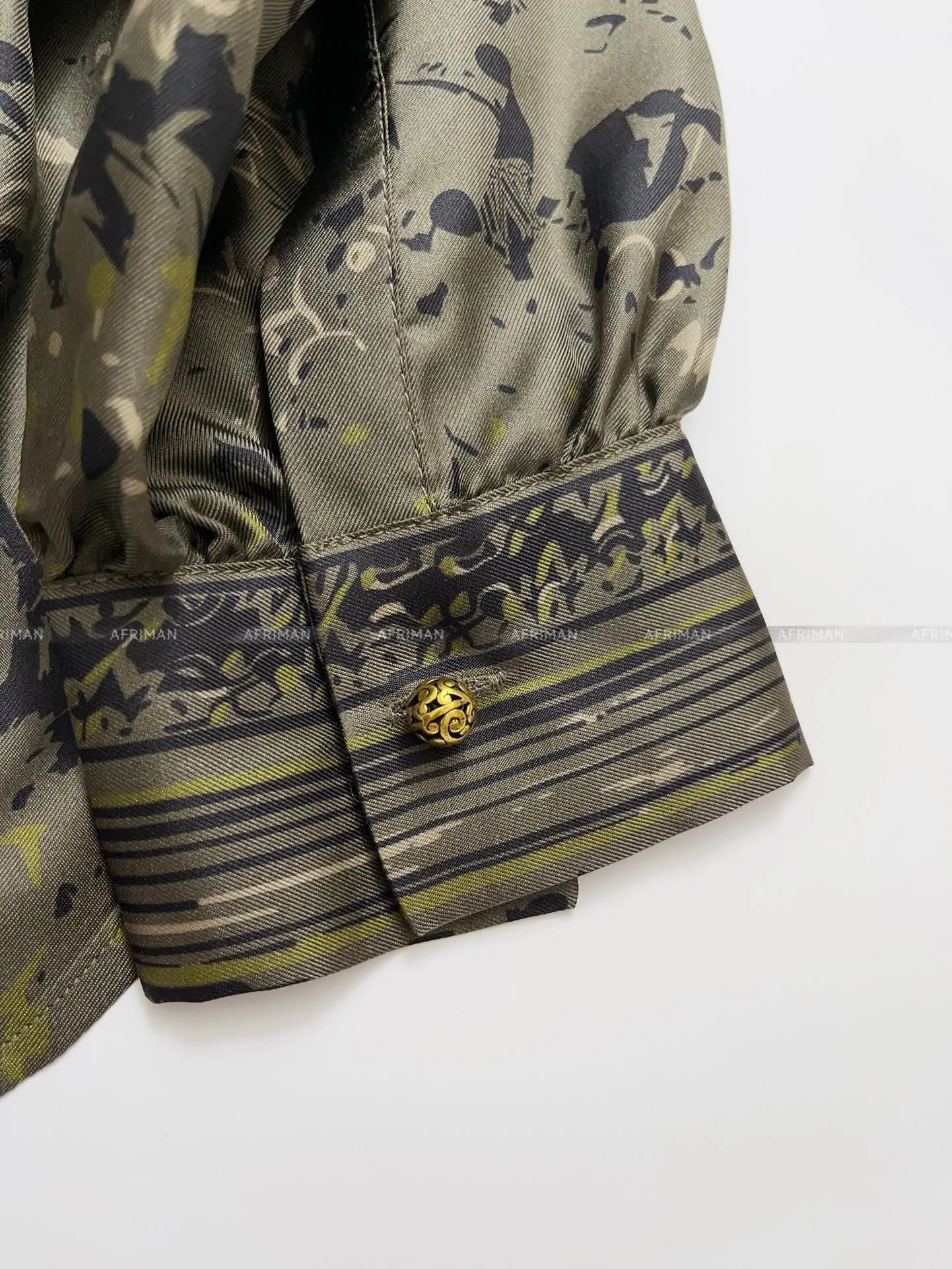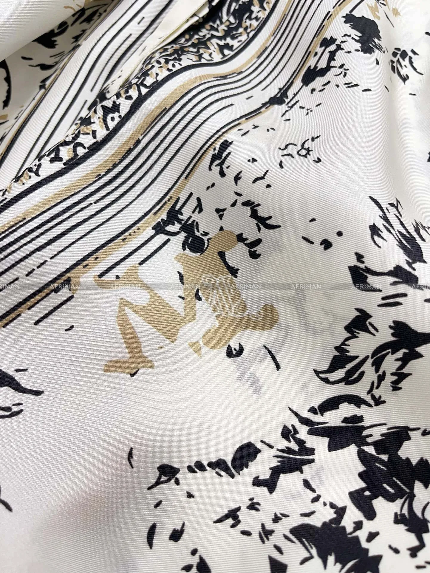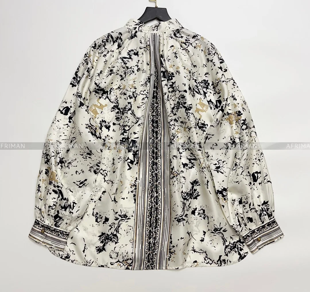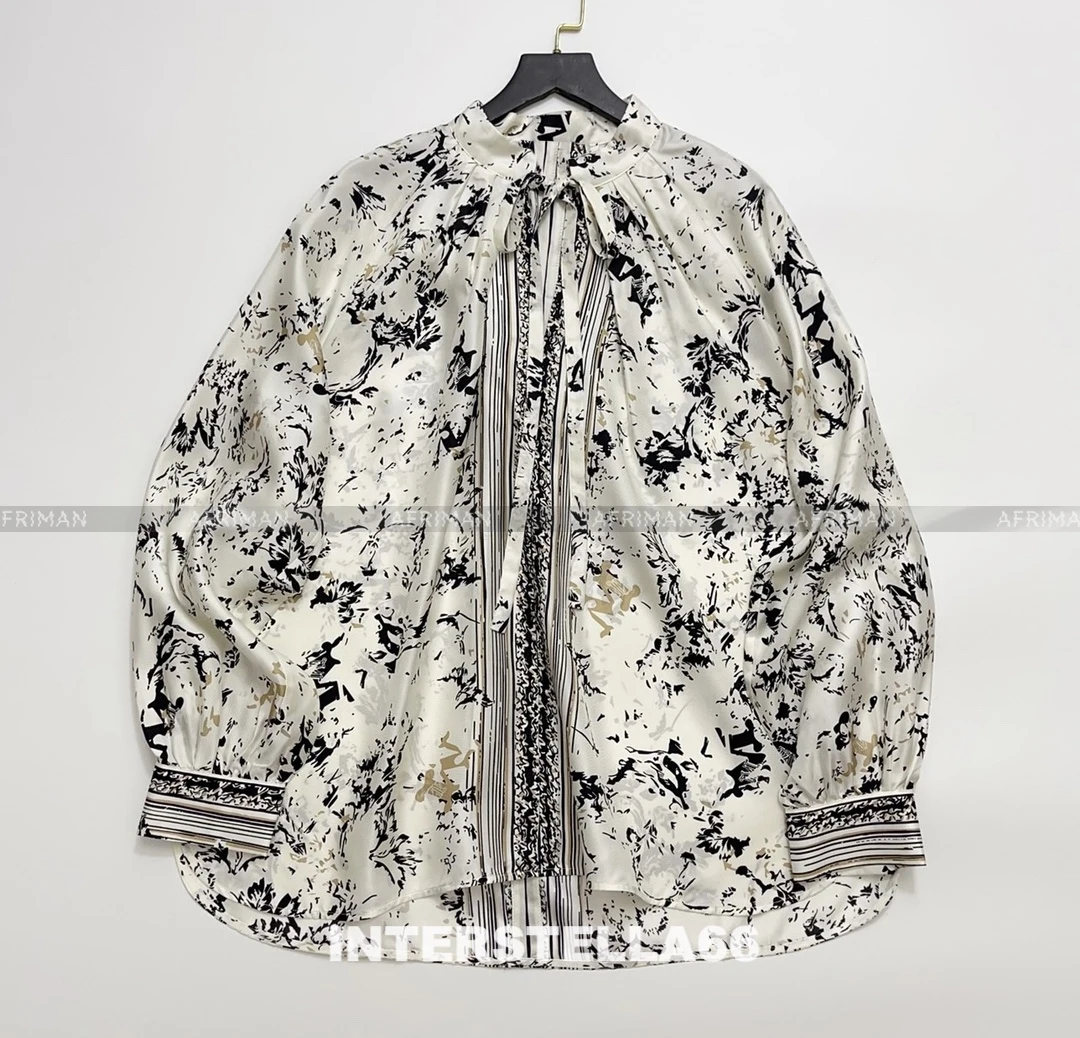 2024 Early Spring Ink Romantic Print Twill Silk Ribbon Collar Bubble Sleeve BlouseTop