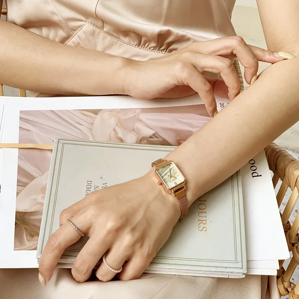 2024 New Women Watches Fashion Square Ladies Quartz Watch Magnetic Strap Green Dial Simple Rose Gold Mesh Luxury Women Watches