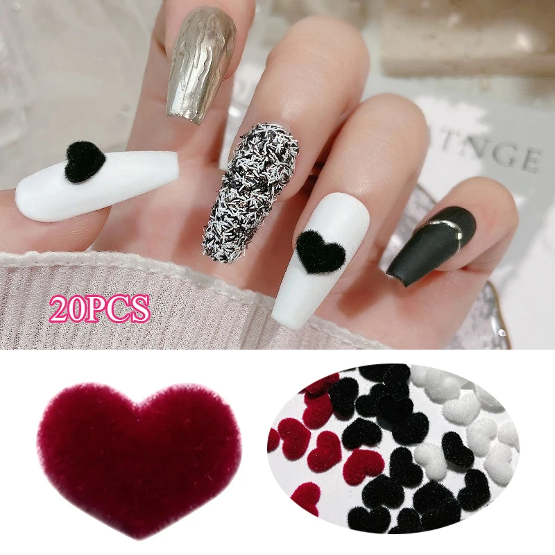20pcs Nail Charm 3D Flocking Velvet Nail Enhancement Accessory Fluffy Nail Jewelry DIY Manicure Plush Love Heart Nail Art Decor