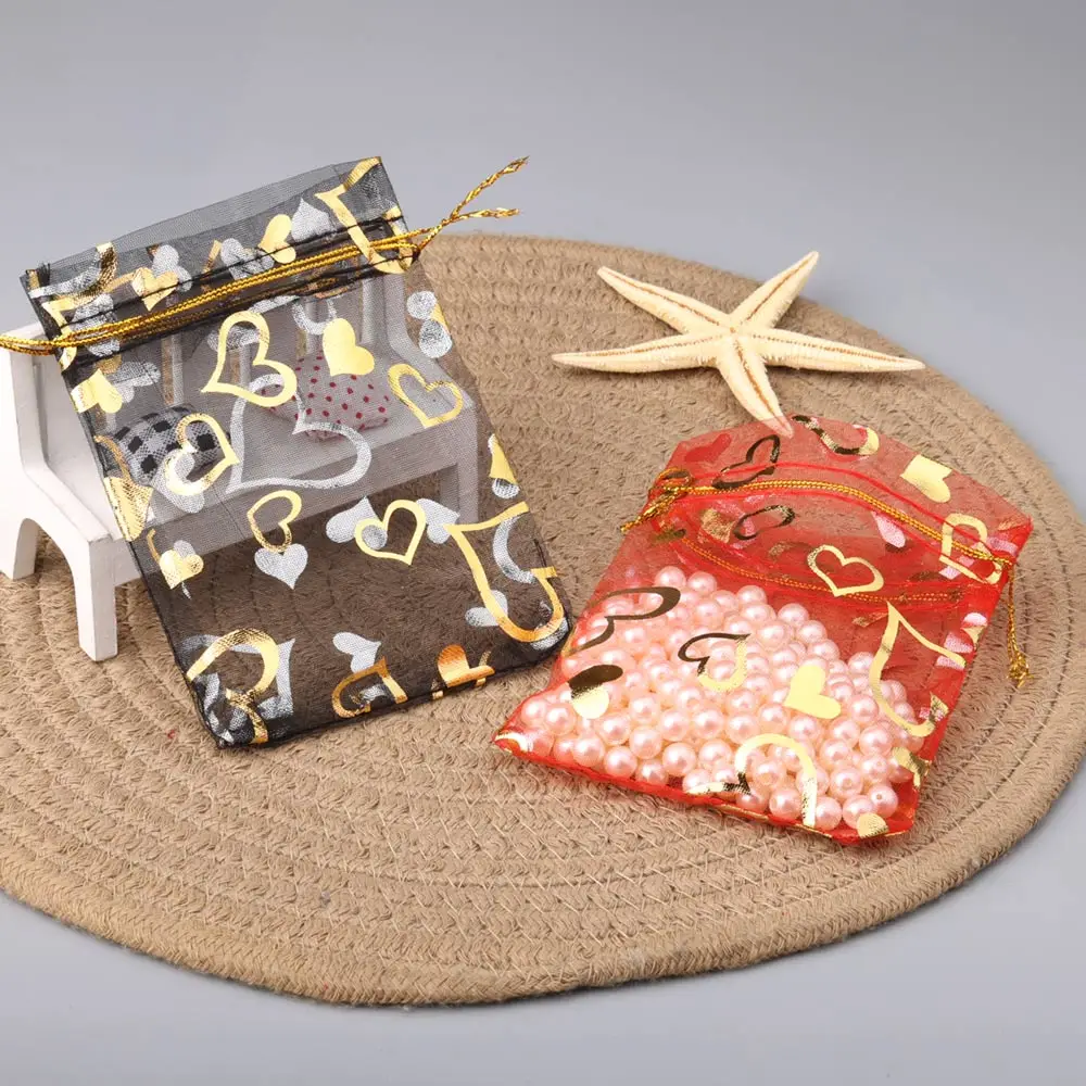 25pcs/50pcs 7×9/9×12/10×15/13x18cm Love Heart Gift Organza Bag Gold Color Printing Drawstring Jewelry Pouch for Party Wedding