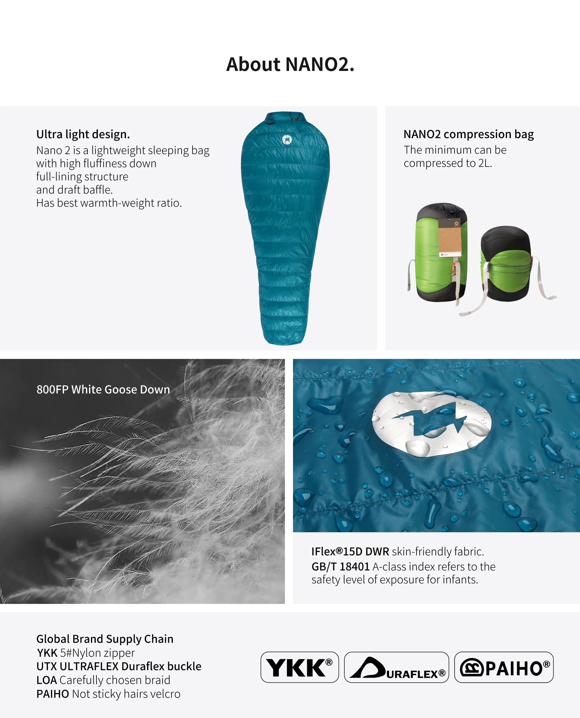 • NANO2-Lengthen: Fill weight 400g | Sleeping bag weight:742g | Total weight:782g | Chest girth 170cm | Hip girth 148cm | Footbox girth 118cm | Package size:28x15cm