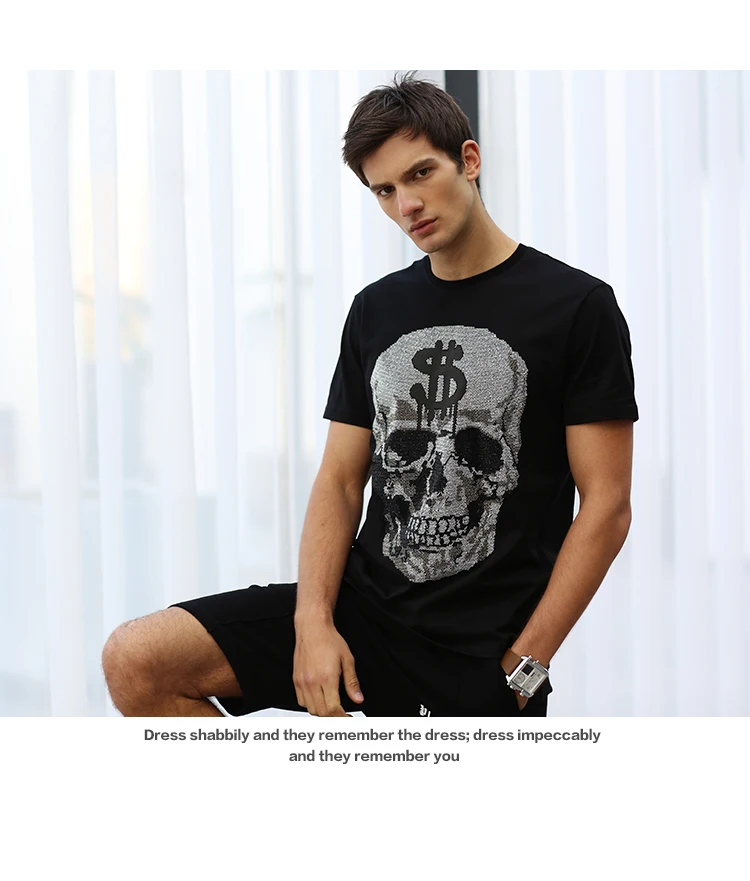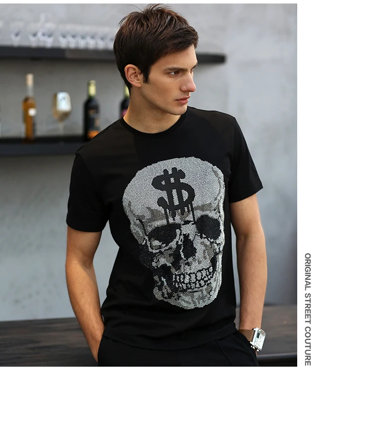 AlexPlein Skulls Dollor Rhinestones Crystal T Shirt Maker Men Clothing Fashion Streetwear 100% Cotton 2021 Summer Short Sleeve