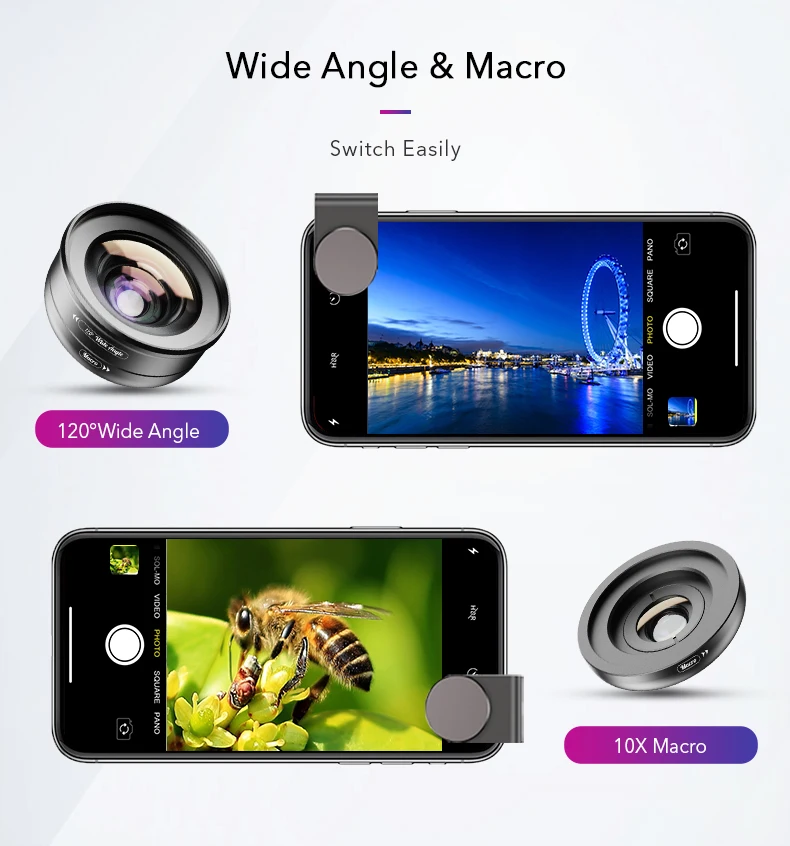 【Compatible with All Single and Dual-camera Phones】 Including all iPhone models, Samsung Galaxy and Note, Google Pixel, Huawei and more.The product includes a 120 degree wide lens and a 10x macro lens, metal clip, cleaning cloth and silicone storage bag