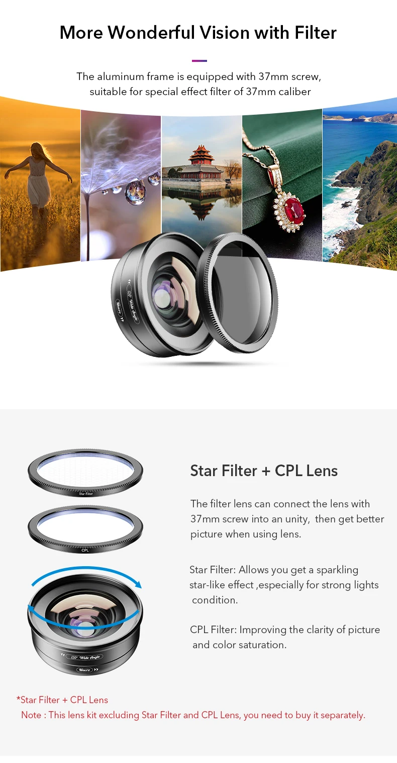 【No Dark Edge No Distortion】 This wide angle lens captures more picture with a multi-element glass design that provides edge to edge clarity. Our lenses are custom made with 4 layers of cinema quality glass and aerospace metal