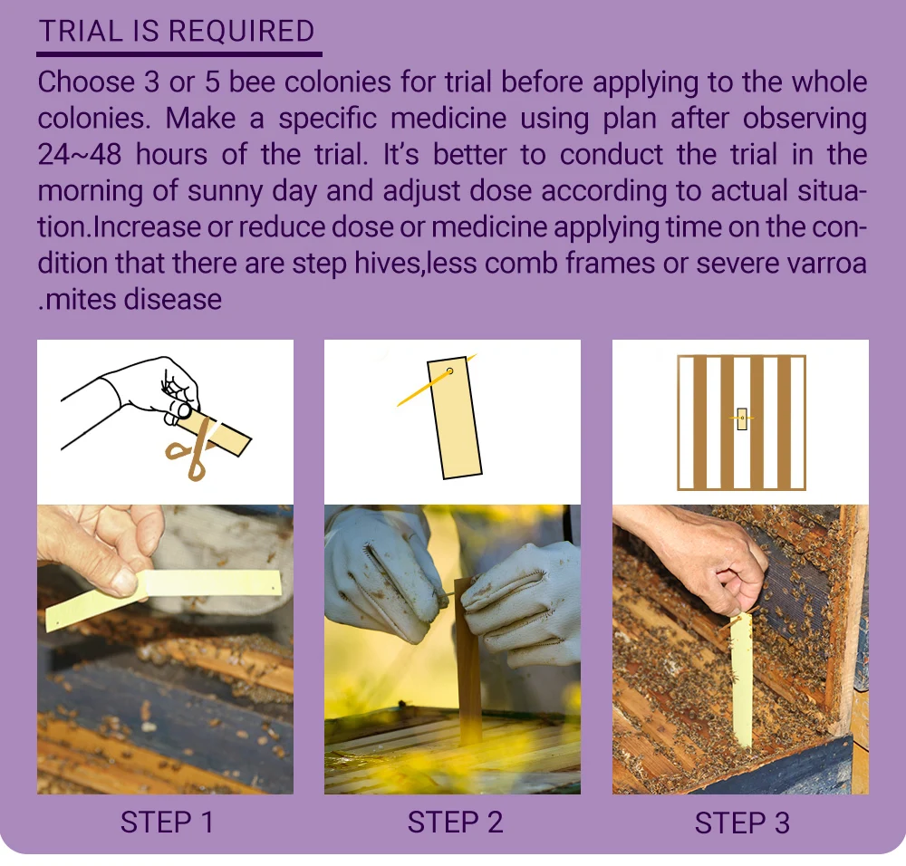 Dosage: For a 10-frame beehive, apply half of a strip (recommended dose). After 5-7 days, replace or add strips (same dose) one more time.Administer the strips 3-4 times as a complete course of treatment.
