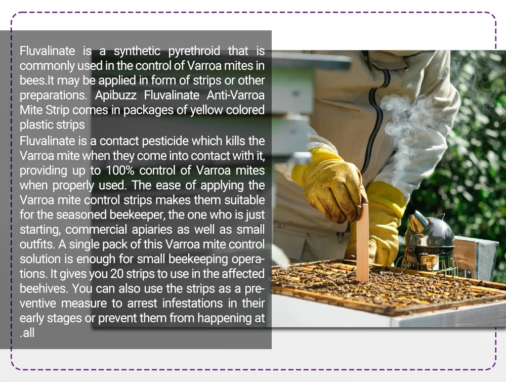 Protect your bees with Apifluva-Pro 80pcs Fluvalinate Varroa Strips, a powerful and effective solution for Varroa mite control in beehives. Made with high-quality materials and formulated for optimal efficacy, Apifluva-Pro is a must-have for any beekeeper looking to maintain healthy apis bee colonies. With our integrated pest management approach, you can feel confident in managing Varroa mites and other pests without the use of harmful substances. Shop now for beekeeping equipment, hive management tools, and organic beekeeping supplies, and enjoy on target orders. Keep your apiary thriving with Apifluva-Pro and our trusted beekeeping products!