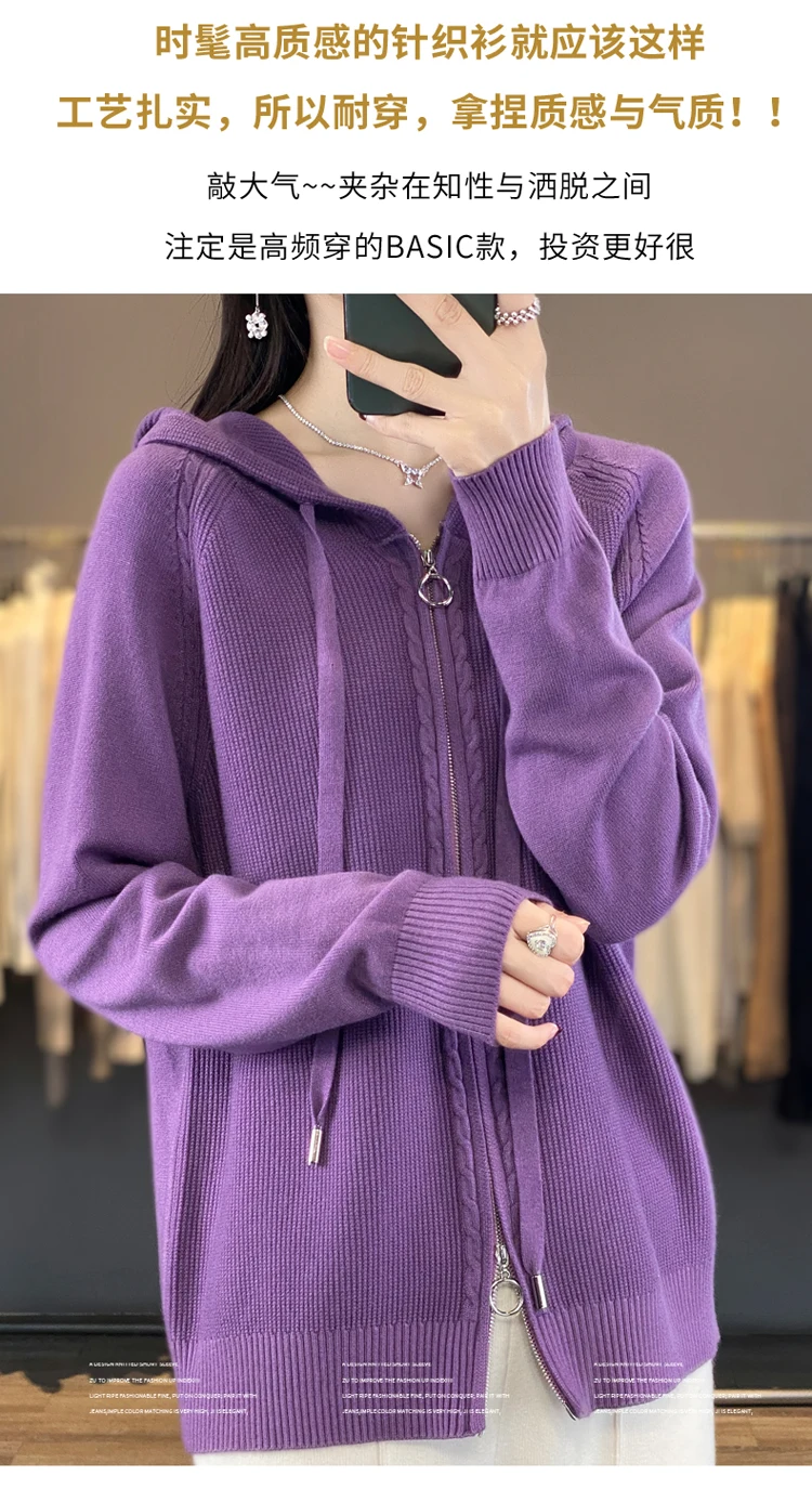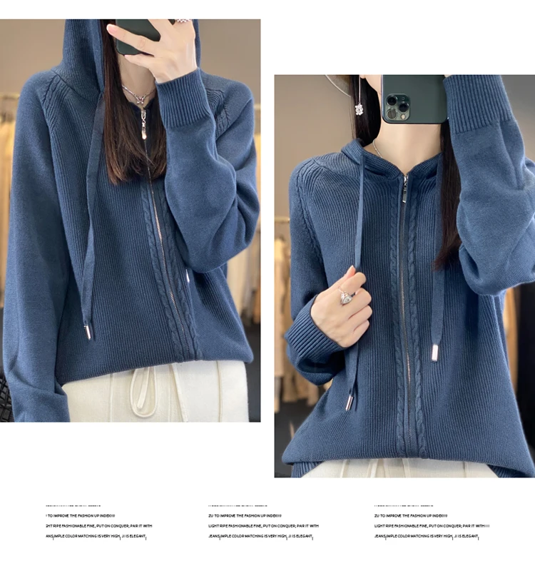 Autumn And Winter New Style Casual Fashion Double Zipper Hooded Knitted Sweater Cardigan Long-sleeved Solid Color Blouse Women
