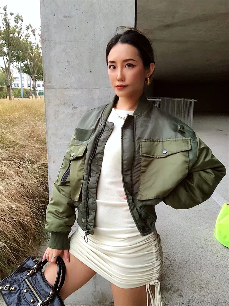 Autumn Winter Women Bomber Jackets Parkas Long Sleeve Casual Pocket Zipper Outerwear Lady Cropped Quilted Coats Jaqueta Feminina