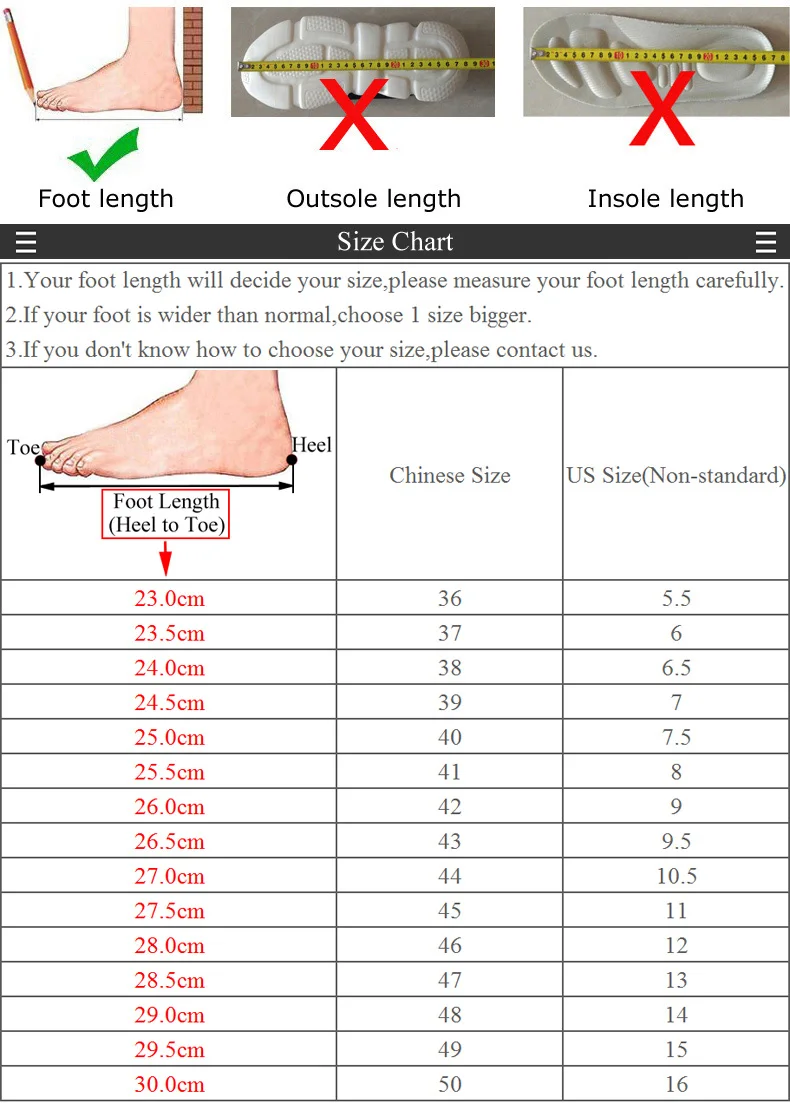 1. Only very exact foot length decide rigth size,please measure your foot length exactly.