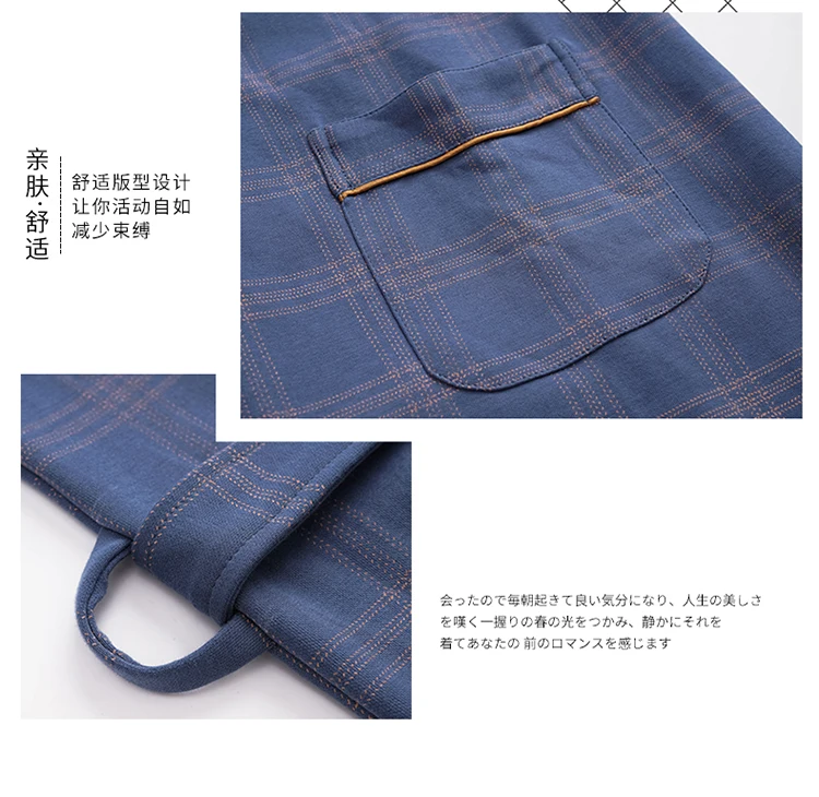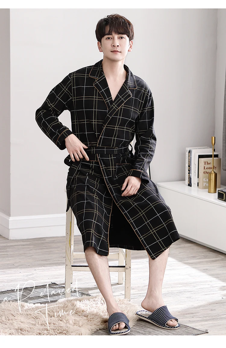 Casual Plaid Men Long Nightgown Kimono Bathrobe Gown Cotton V-neck Intimate Lingerie Long Sleeve Spa Robes Sleepwear For Male
