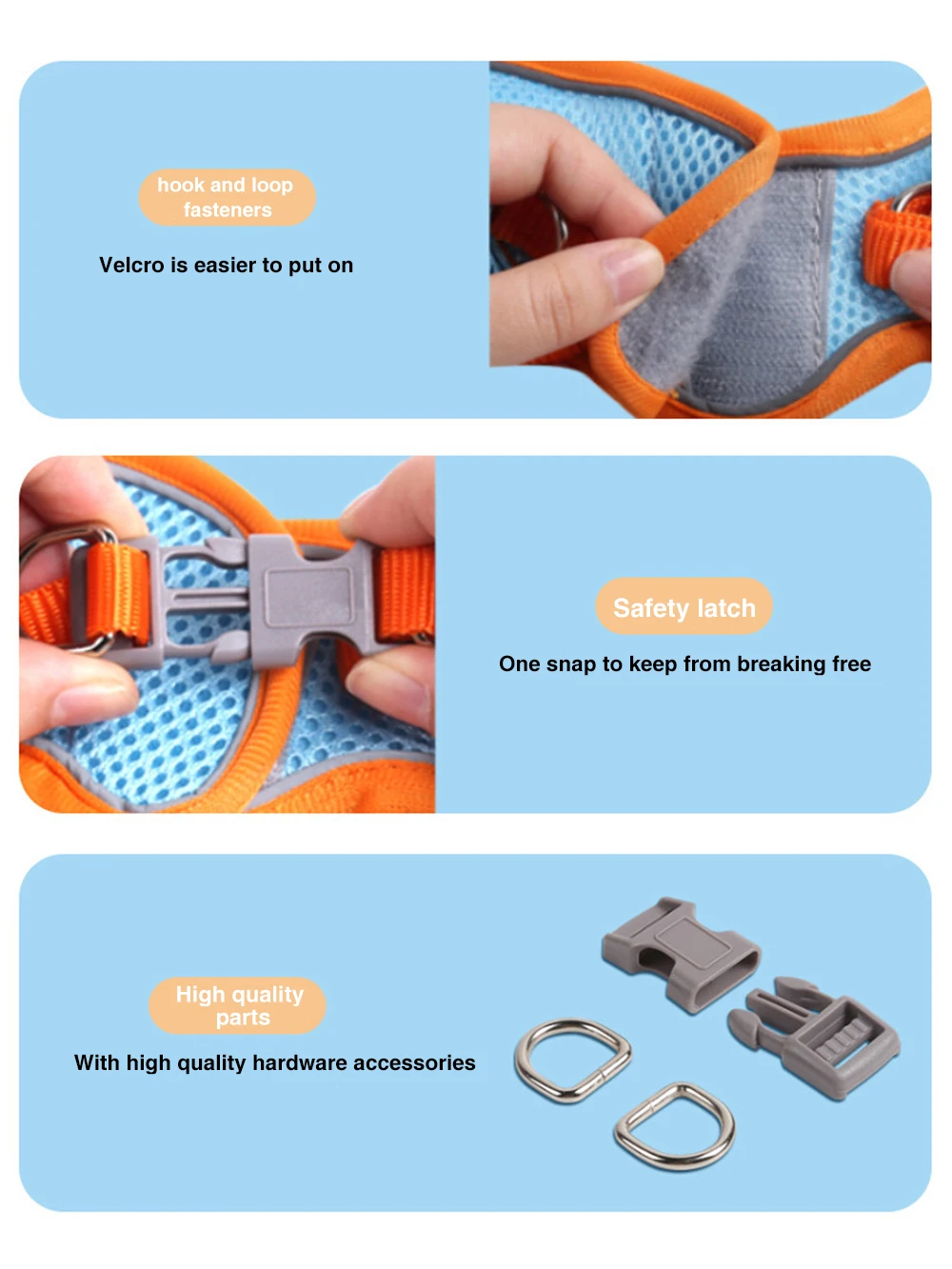[Easy put on and take off] Step-in, your pet can wear it within a few seconds. The specific shape design not only makes it very simple to wear, it can evenly distribute the pulling force to the dog ’s body, It ’s a real no pull & no choke pet harness.