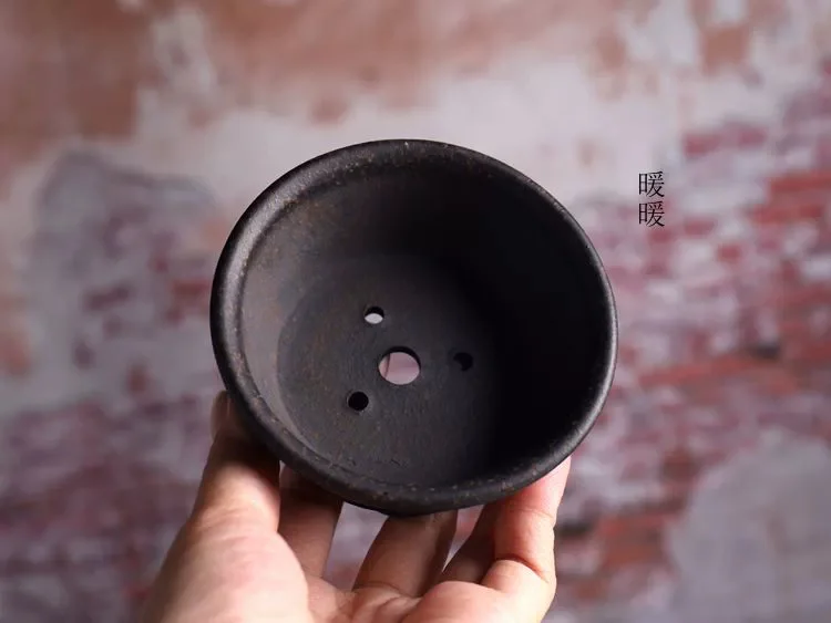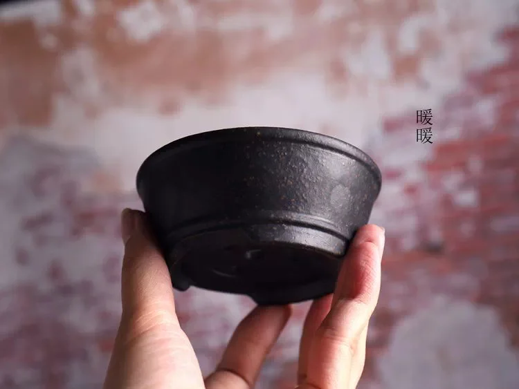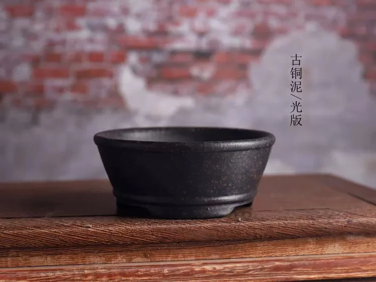 Ceramic Circle Bowl Bonsai Pot Hand Carved Vertical Stripes Pattern Chinese Garden Home Table Decoration