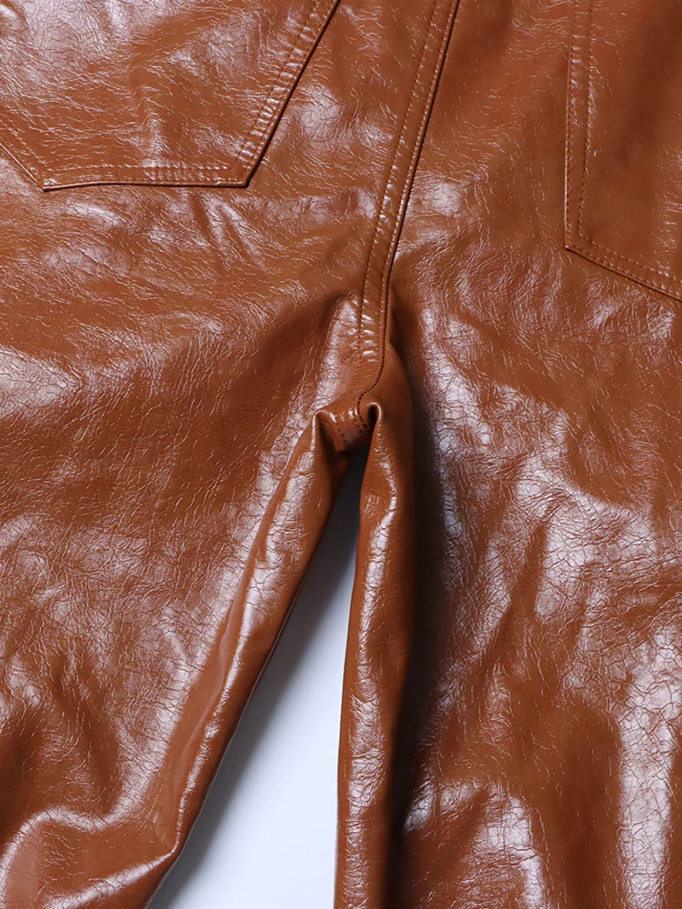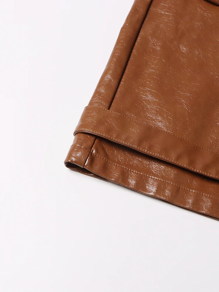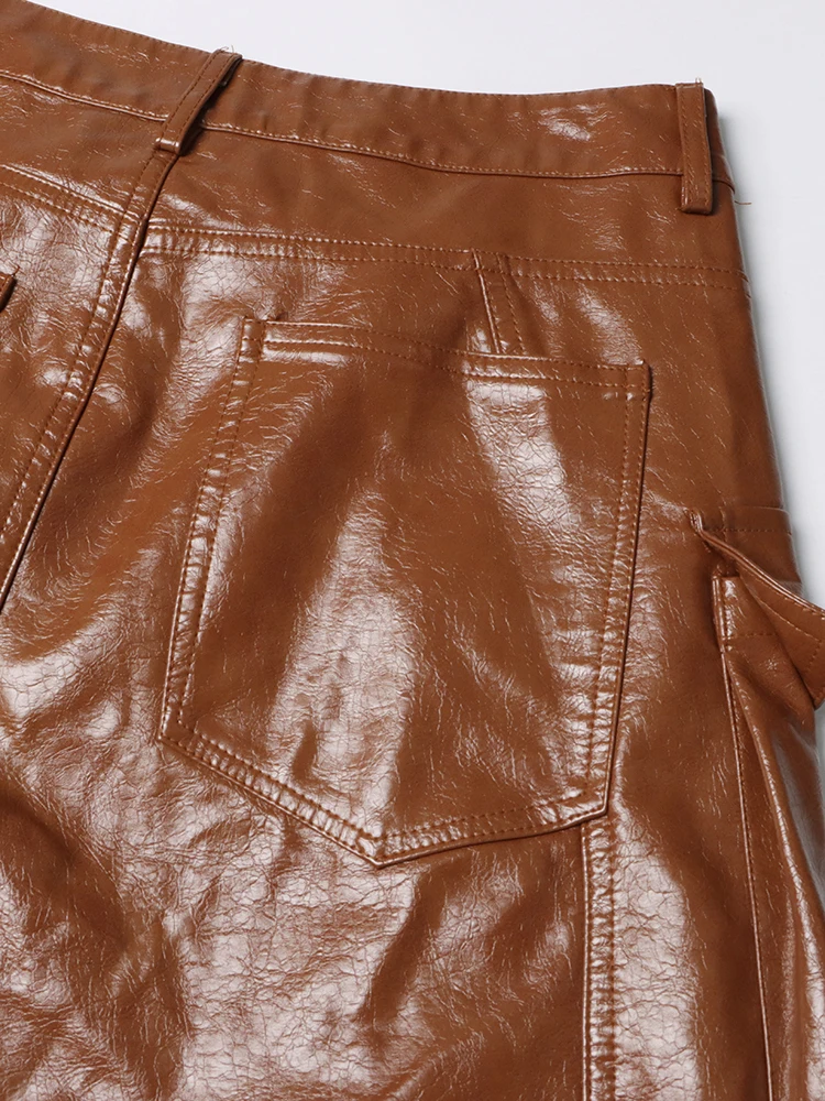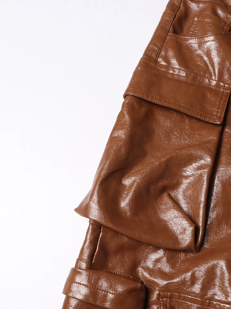 CHICEVER Solid Cargo Pants For Women High Waist Patchwork Pockets Casual Chic Pu Leather Trousers Female Autumn Clothing 2023