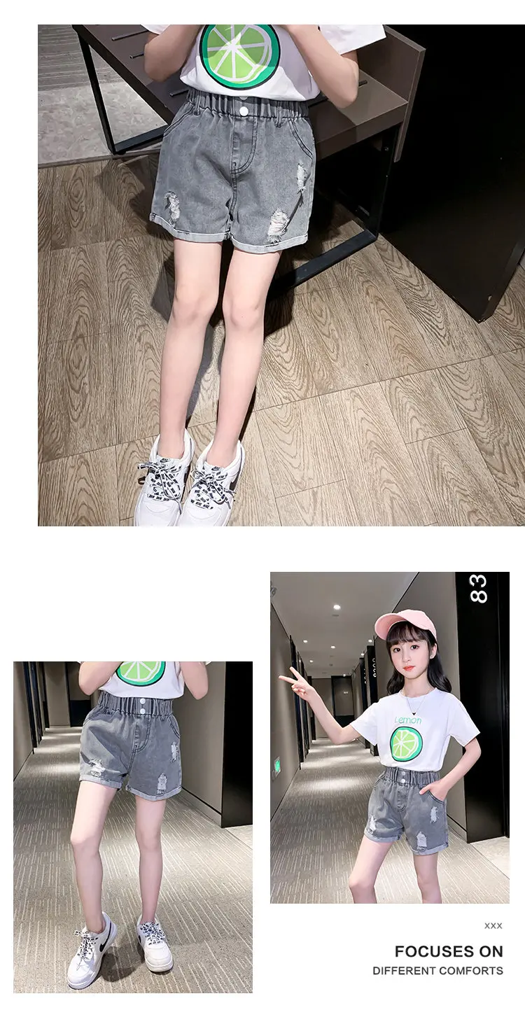 Children’s Grey Denim Shorts With Button Girls Summer Cotton Jeans for Kids Girl Ripped Short Jeans for Teens Fashion Clothing 4-13Y