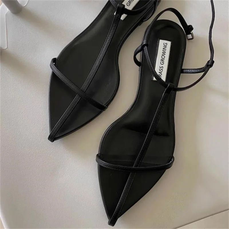 Crossover Belt Ladies’ Shoes Black Sandals Pointed Toes Zapatos De Mujer Flat Heels Female Ankle Strap Women Buckle Sandalias