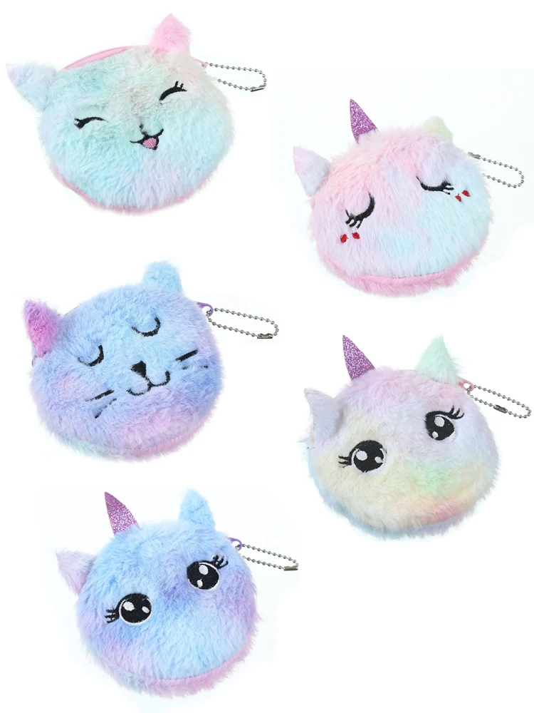 Cute Cartoon Plush Unicorn Coin Purse Cat Fur Circle Wallet Girl Clutch Embroidered Bag Key Earphone Organizer Bags Kids Gift