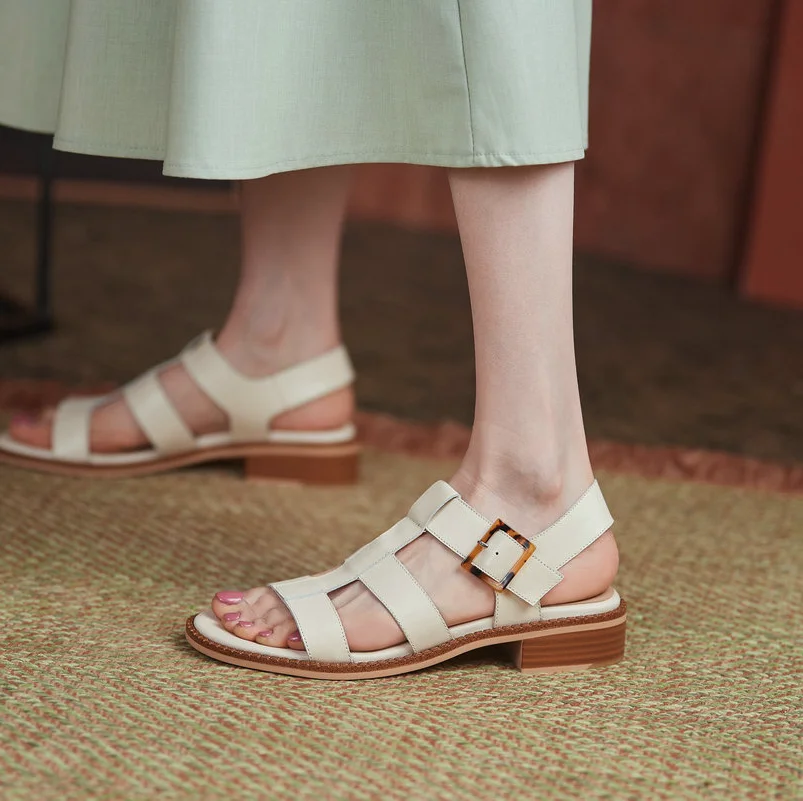 Dousin Partin 2022 Women Sandal Square Low Heel Round Toe Buckle Cow Leather Hollow Slingback Sexy Ladies Pumps Summer