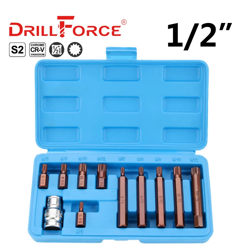 Drillforce 11PCS M5-M12 1/2″ Drive Spline Socket Bits Set S2 Adapter Torque Spanner Ratchet Wrench Home Repair Tools M5/M6/M8/M10/M12