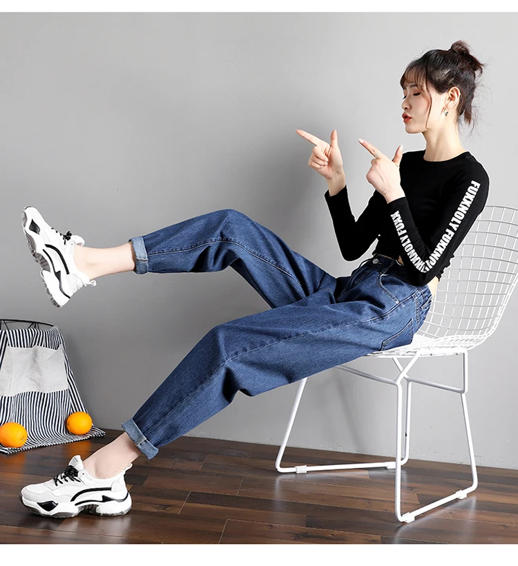 elastic waist black jeans korean fashion 4 collor mom jeans high waist jeans High Street plus size denim pants street style