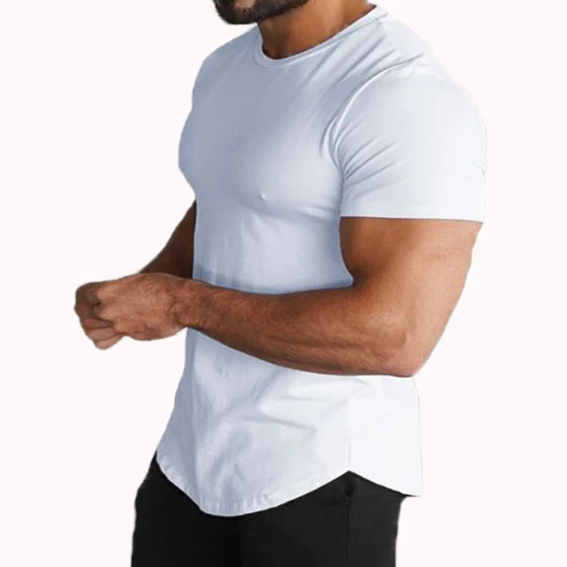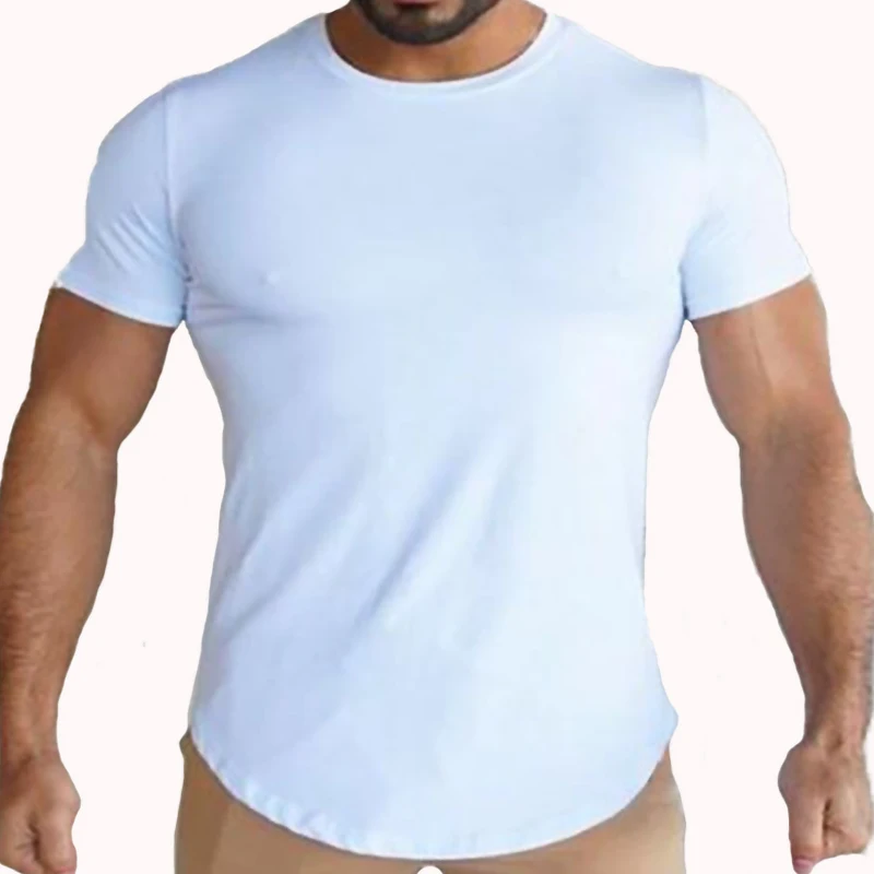 European And American Men’s Fitness Sports Breathable Quick-drying Elastic Solid Color T-shirt Curved Hem Casual Hot Sale