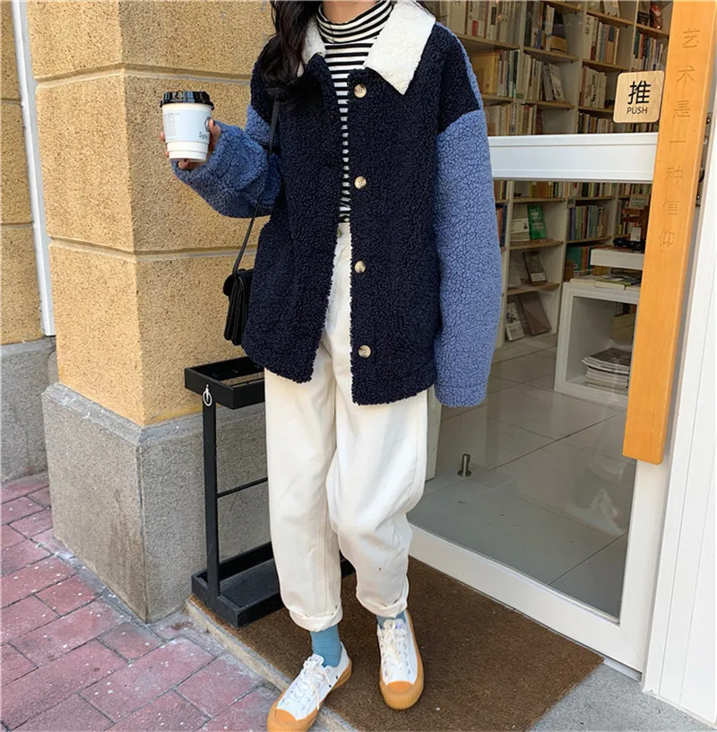 Fashion WomenAutumn Winter White Faux Fur Coat Long Sleeve Loose Thick Warm Lambs Wool Bomber Jacket Female