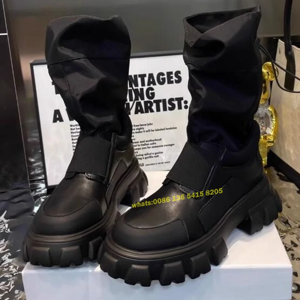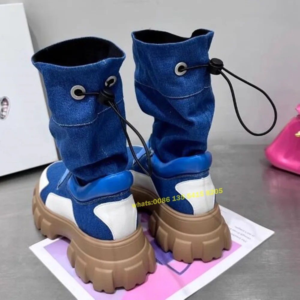 Female 2024 Winter New Style Drawstring Spliced Round Toe Mid Length Boots with Small Design Fashionable Platform Patchwork Shoe