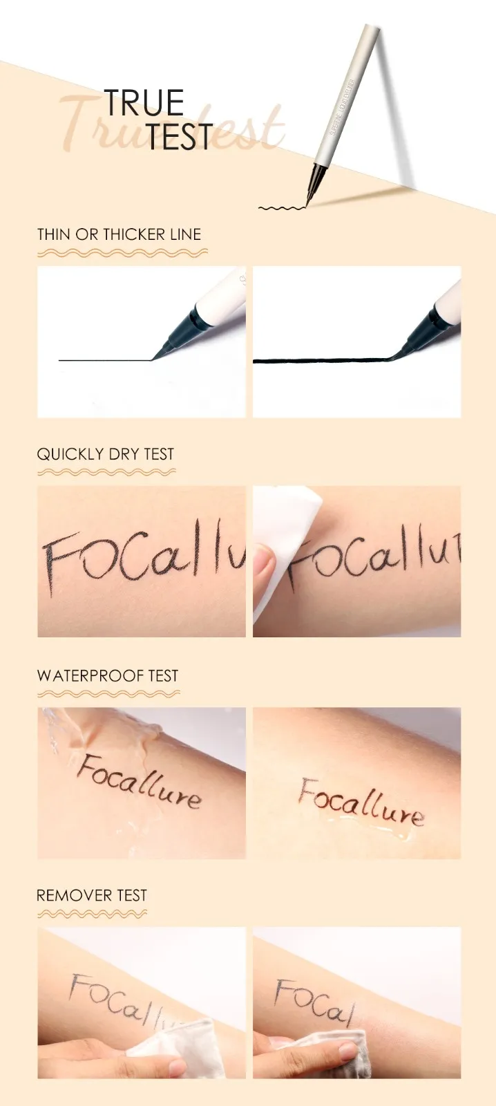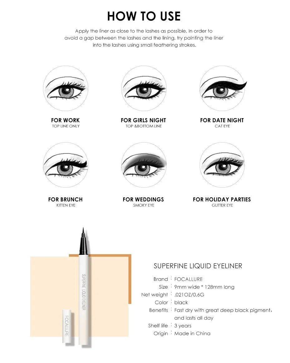 FOCALLURE Waterproof Long-lasting Black Liquid Eyeliner Ultra-thin Quick-Dry Smooth Eye Liner Pencil Eyes Makeup Cosmetics Tools