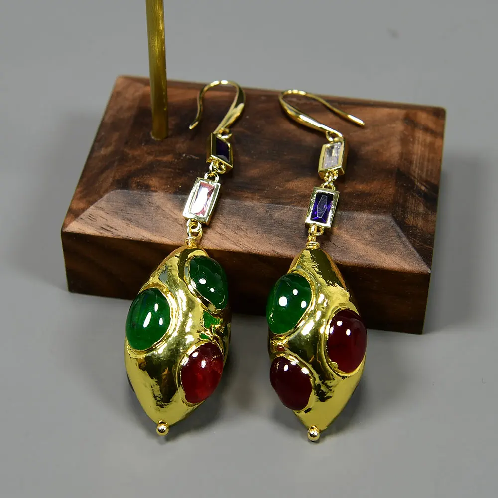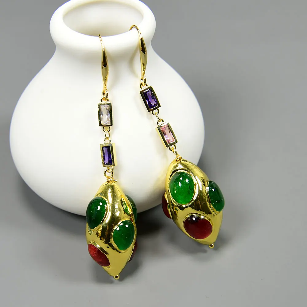 GG Jewelry Green Red Agate Yellow Gold Plated Olivary Shape CZ Chain Dangle Earrings Jewelry Gifts For Women