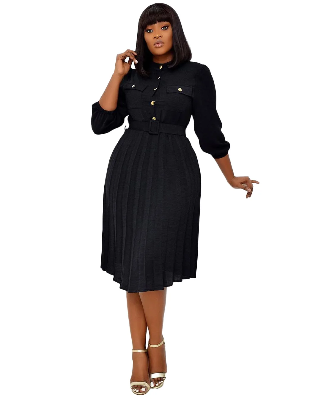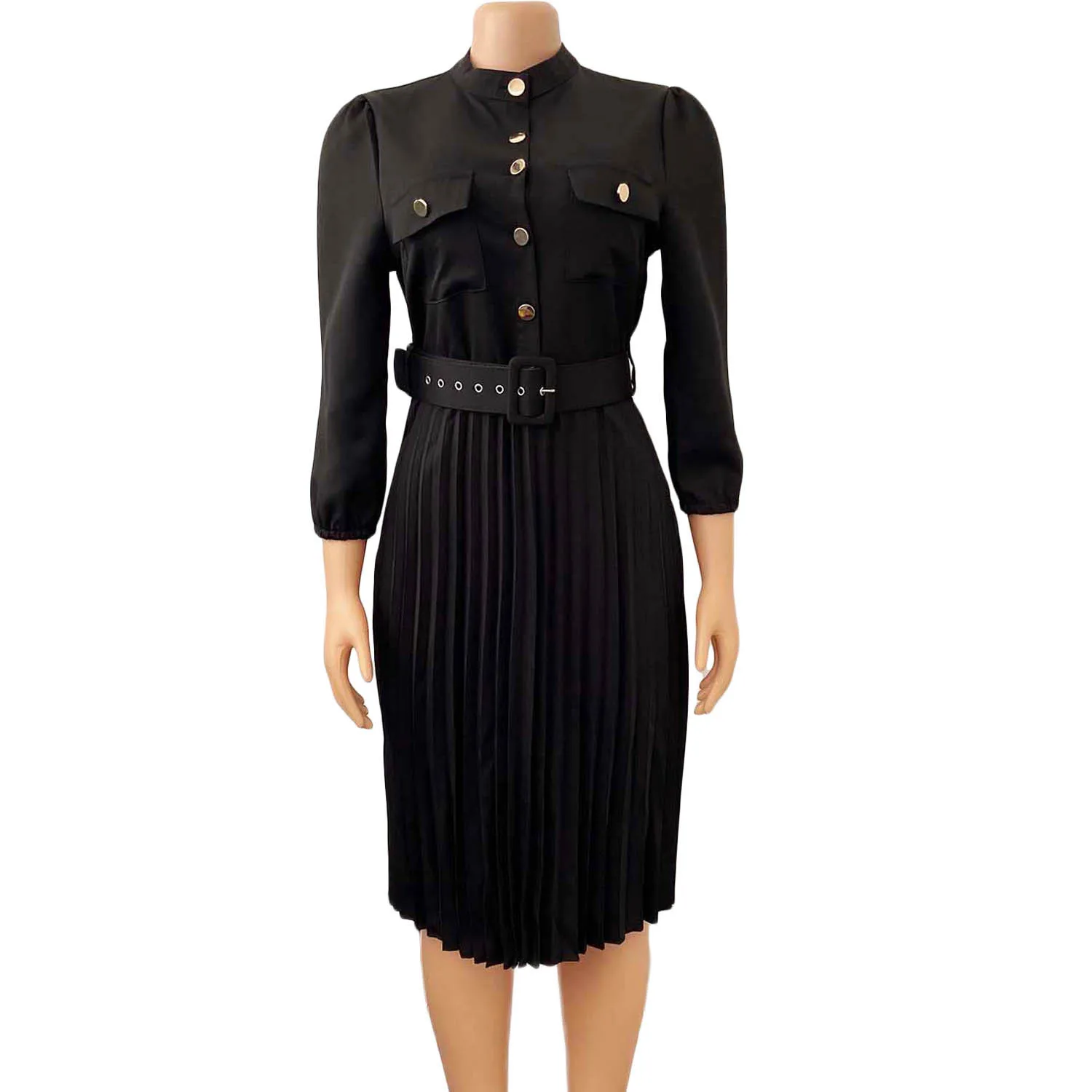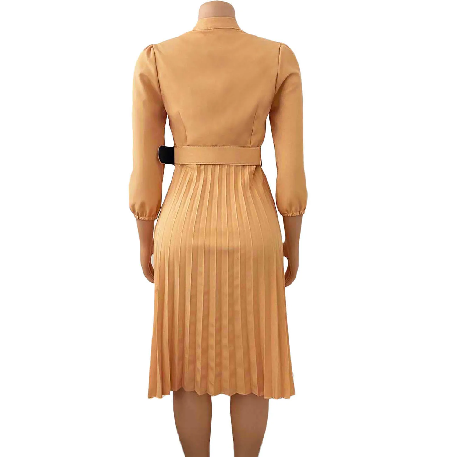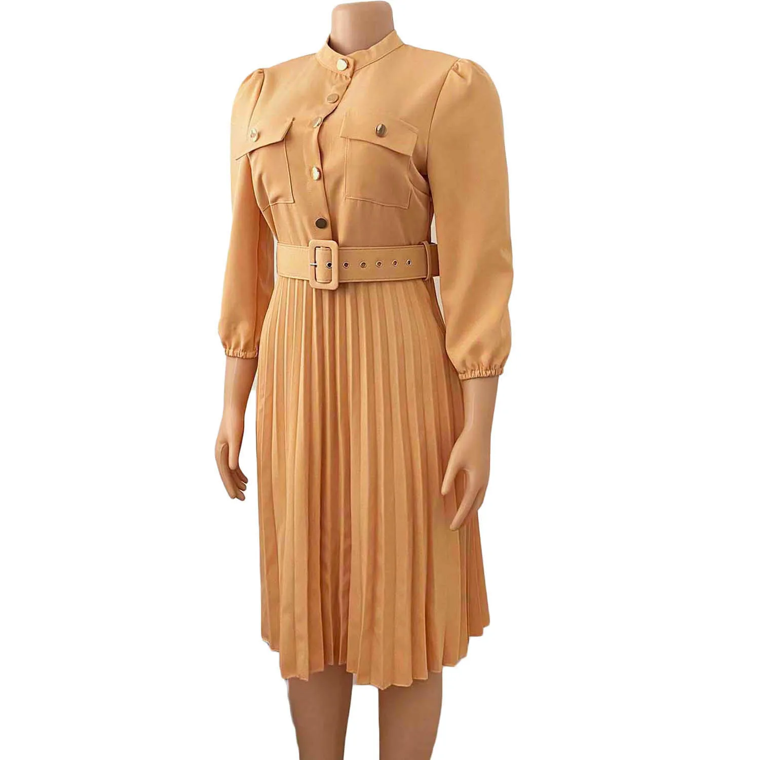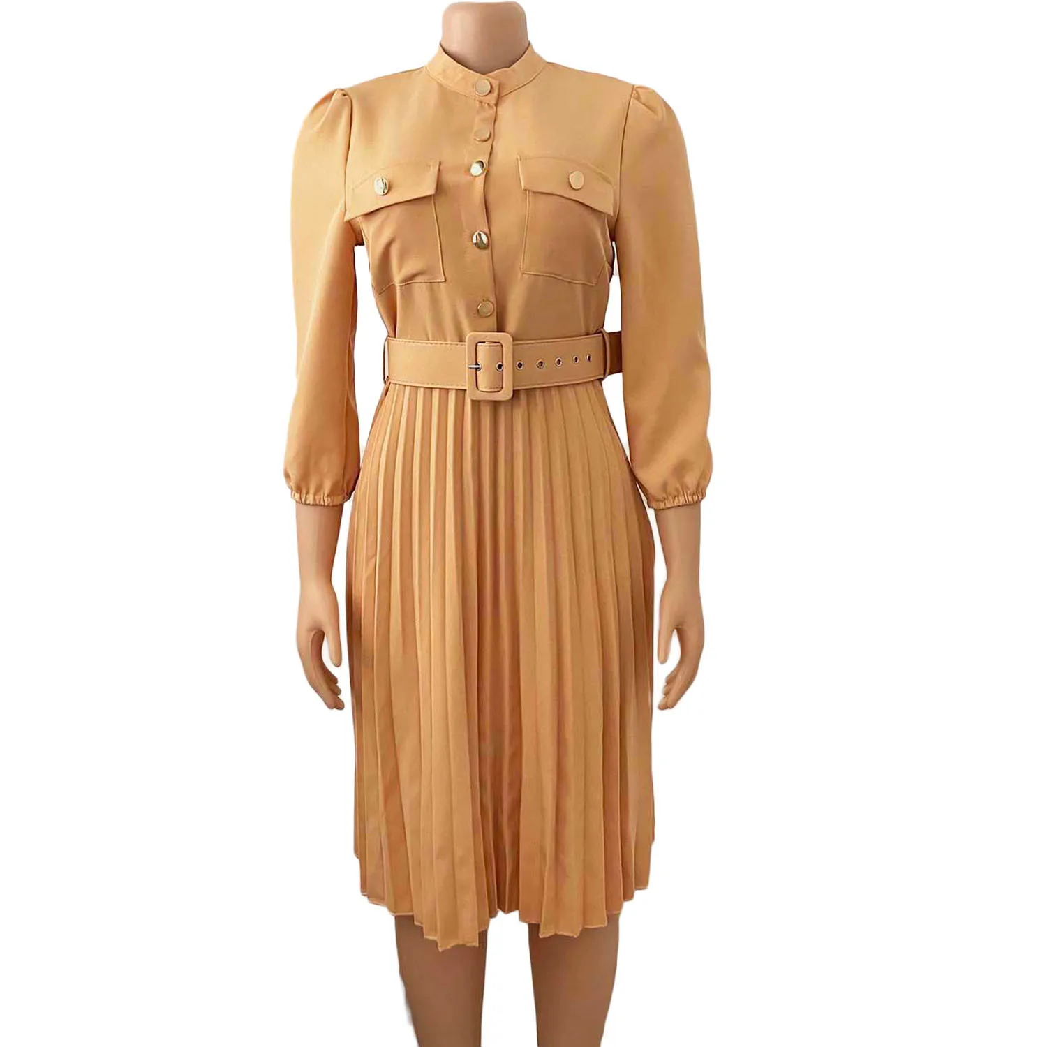 HGTE Women Long Sleeve Pleated Dresses with Pockets Waist Belt A Line Button Up Female Fashion Autumn Solid Color Oversize Lady