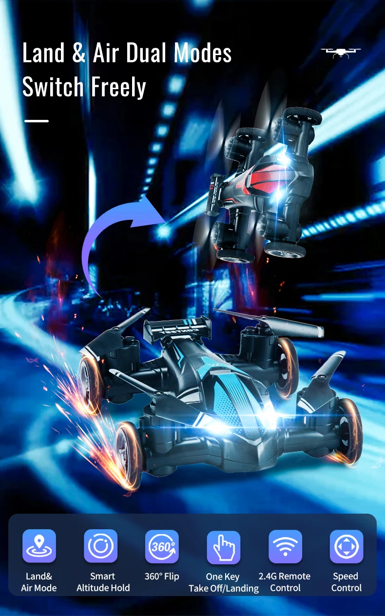 Function: Forward/backward, up/down, left/right, sideward flight, hovering, 3D-flip, headless mode, high/mid/low speed, Altitude Hold, car mode run on the ground