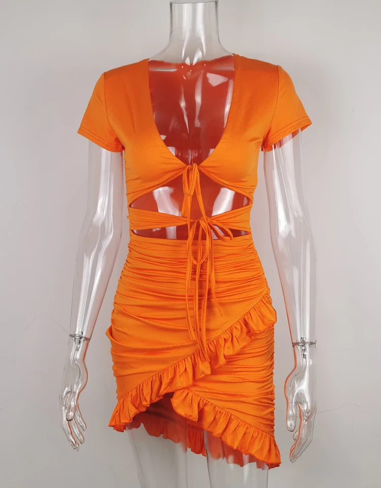 Karlofea New 2020 Summer Orange Everyday Wear Mini Dress Sexy High Cut Hollow Out Lace Up Ruched Wrap Dress Chic Ruffles Outfits
