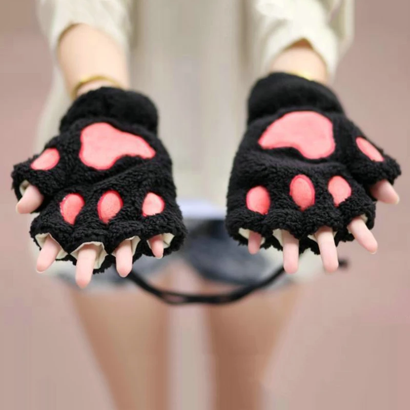 Kawaii Cat Gloves For Women Fashion Girls Cat Claw Paw Plush Mittens Warm Soft Plush Fingerless Half Finger Winter Gloves Gifts