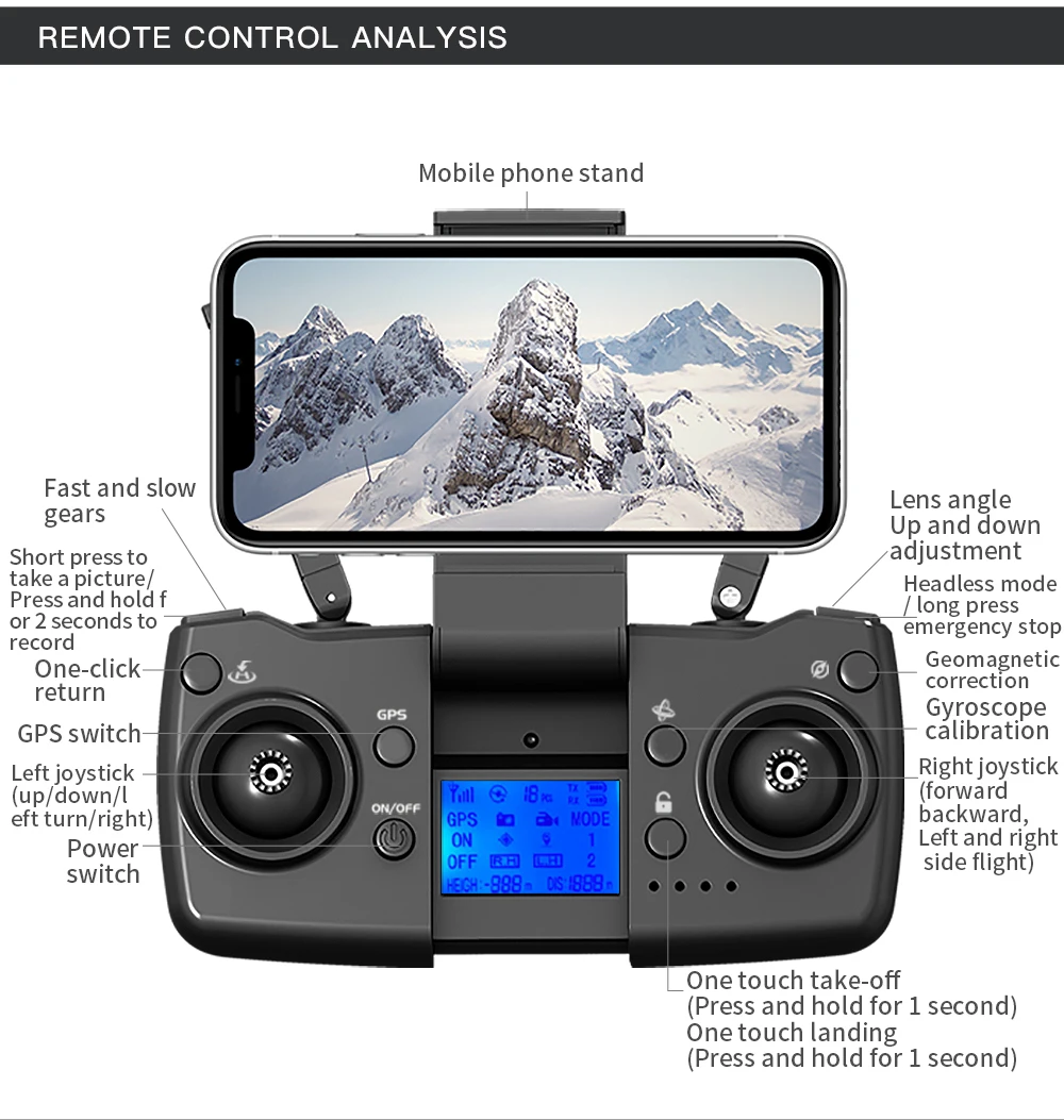 4. GPS Assisted Flight. Provides you with accurate positioning details of your drone.The drone will automatically return to home precisely when its battery is low or the signal is weak when flying out of range,never worrying about losing the drone.
