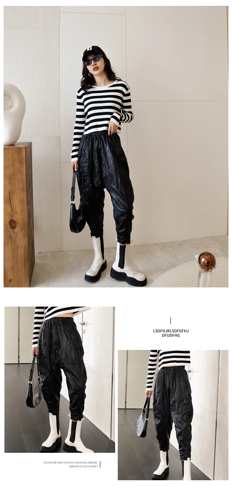 Leather Pants Women 2022 Quality Sheepskin Black Pleated Outer Wear Elastic Waist Harem Trousers Folded Pantalon Pour Femme
