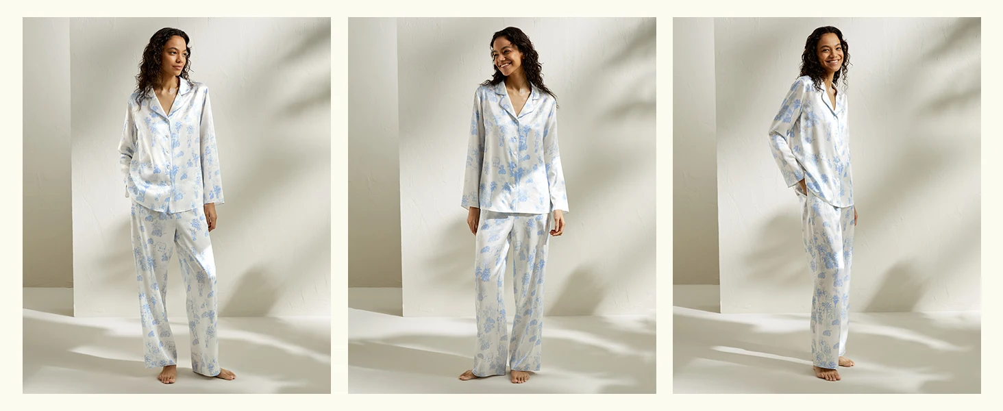 Introducing the La Terra Long Pajama Set, featuring a delightful light blue print that encapsulates the beauty of the world’s skies and oceans together with patterns featuring charming elephants and whimsical trees. Crafted with care and attention to detail, these pajamas offer both style and comfort. Made from soft and breathable organic silk, they provide a cozy and relaxing fit for a restful night’s sleep.