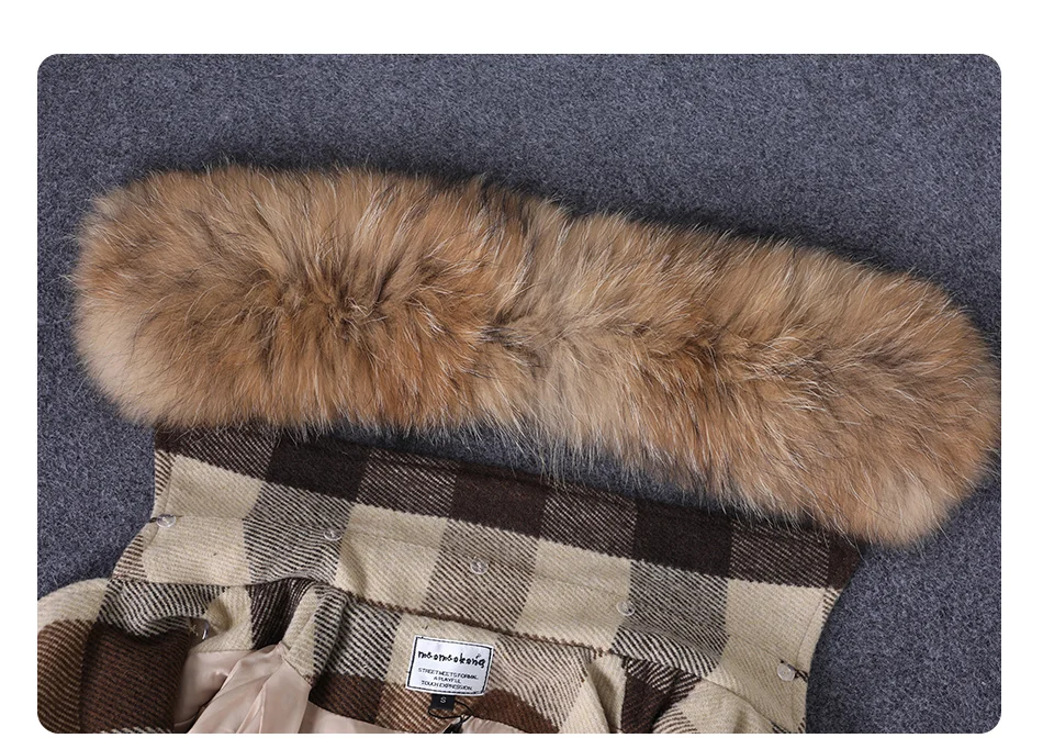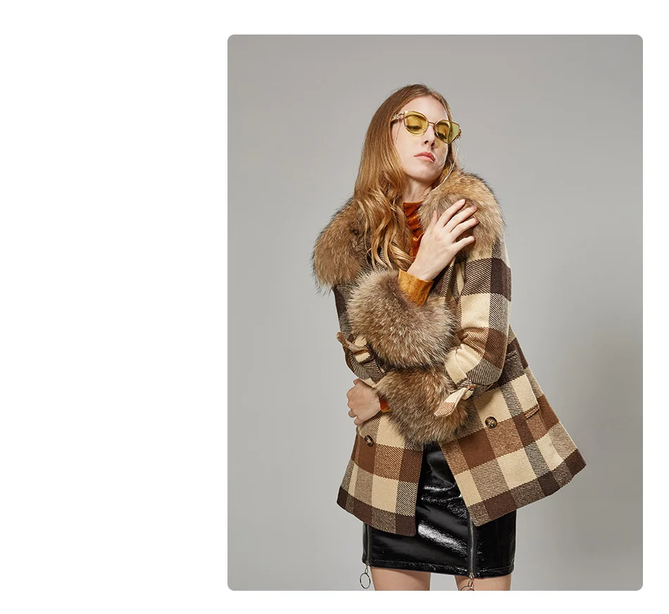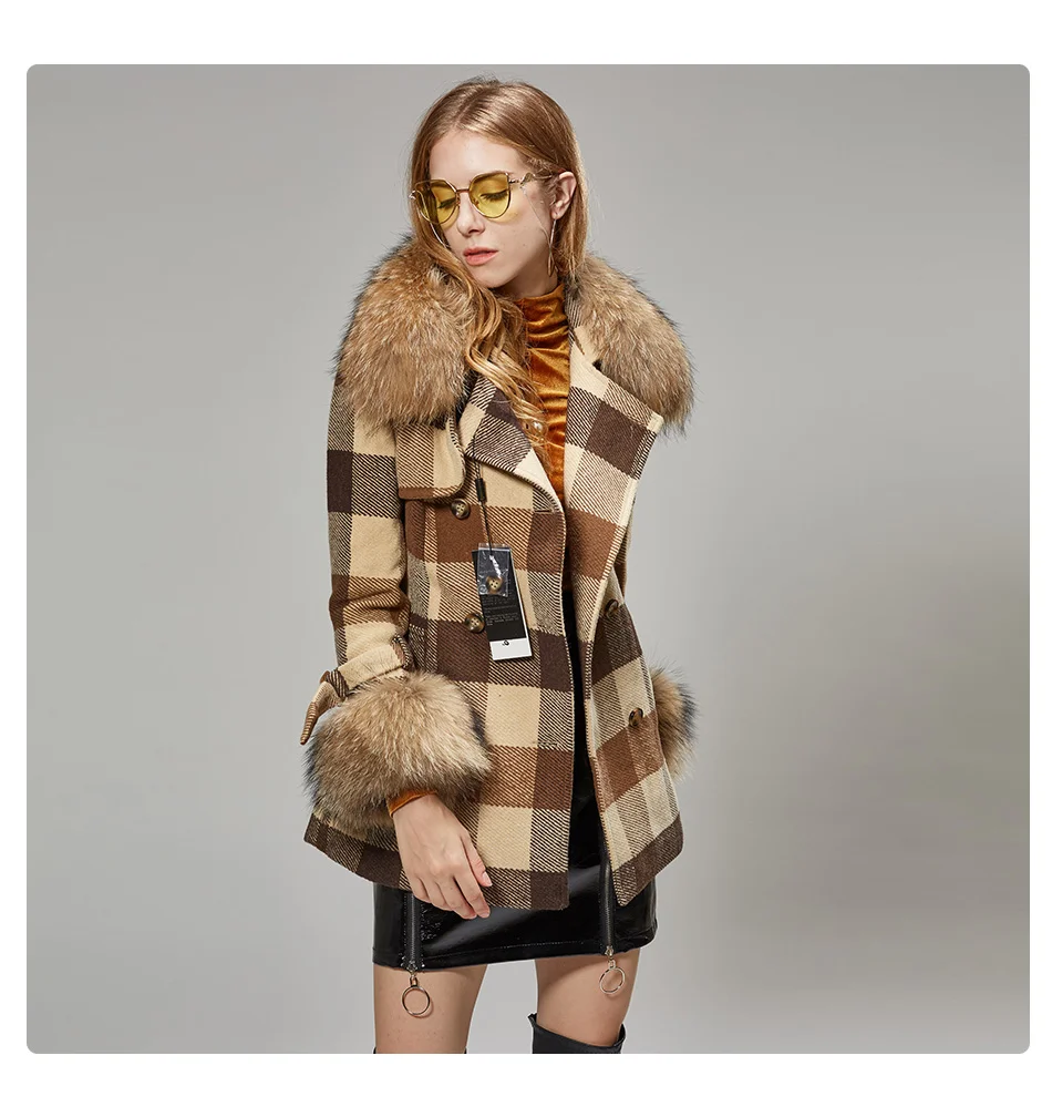 MAOMAOKONG 2022 Autumn Natural Real Raccoon Fur Collar Removable Cuffs Women Plaid Jacket Female Woolen Coat Winter Outerwear