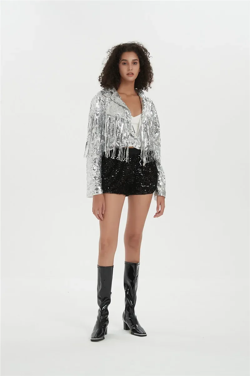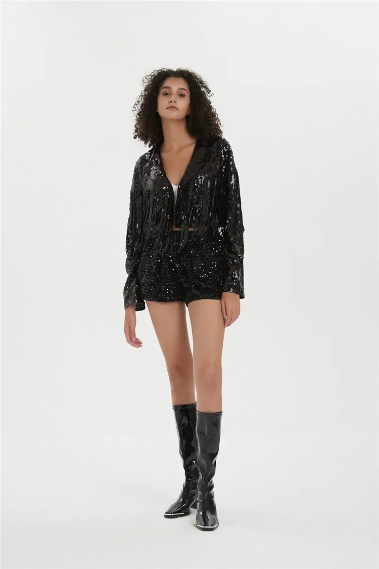 New Long Sleeve Sequin Tassel Patchwork Coat Cardigan Solid Color Turn-Down Collar Streetwear Hip Hop Women Jacket